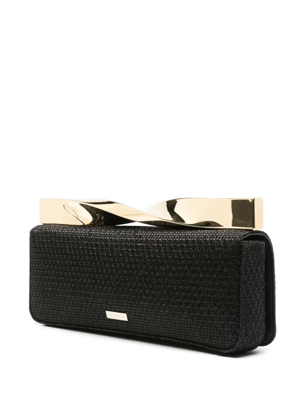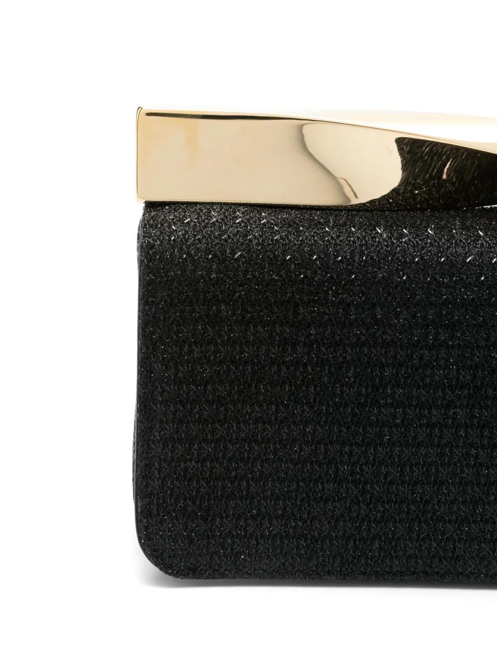 black foldover top with magnetic fastening single metallic top handle detachable shoulder strap This piece comes complete with a protective dust bag.