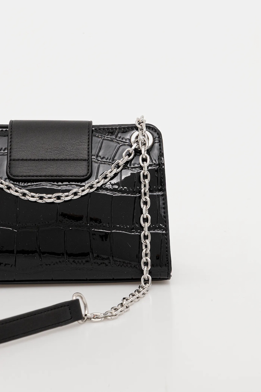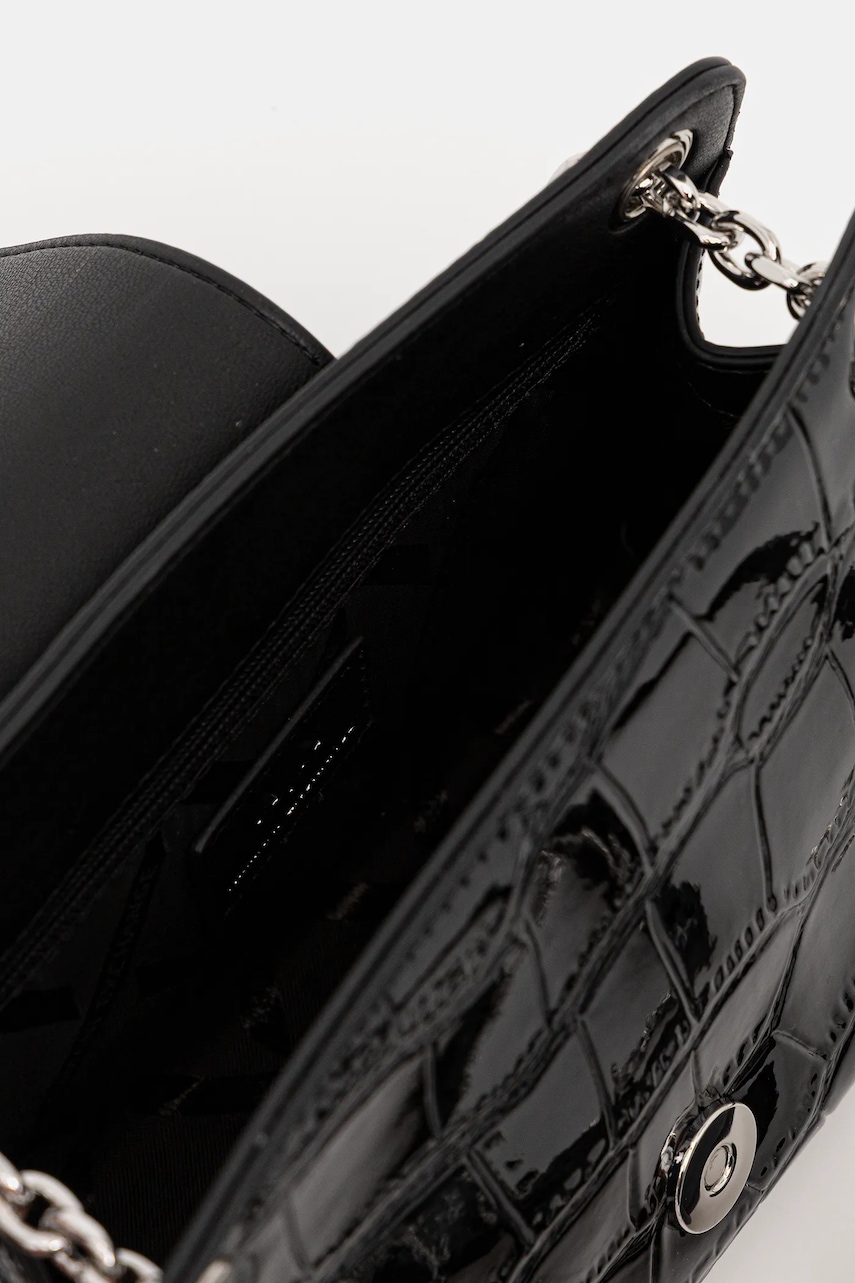- Klapa zapinana na magnes. - Kieszonka wewnętrzna zapinana na suwak pozwala na bezpieczne przechowywanie drobiazgów. - Usztywnione dno torebki pozwala zachować kształt produktu przez długi czas. - Torebka do noszenia w ręku lub na ramieniu. - Nieodpinany, regulowany pasek umożliwia indywidualne dopasowanie. - Nie mieści formatu A4. - Model z podszewką. - Dołączony tekstylny worek zabezpiecza produkt przed kurzem. - Długość minimalna paska: 68 cm. - Długość maksymalna paska: 124 cm. - Głębokość: 9 cm. - Wysokość: 13 cm. - Szerokość u podstawy: 20 cm.