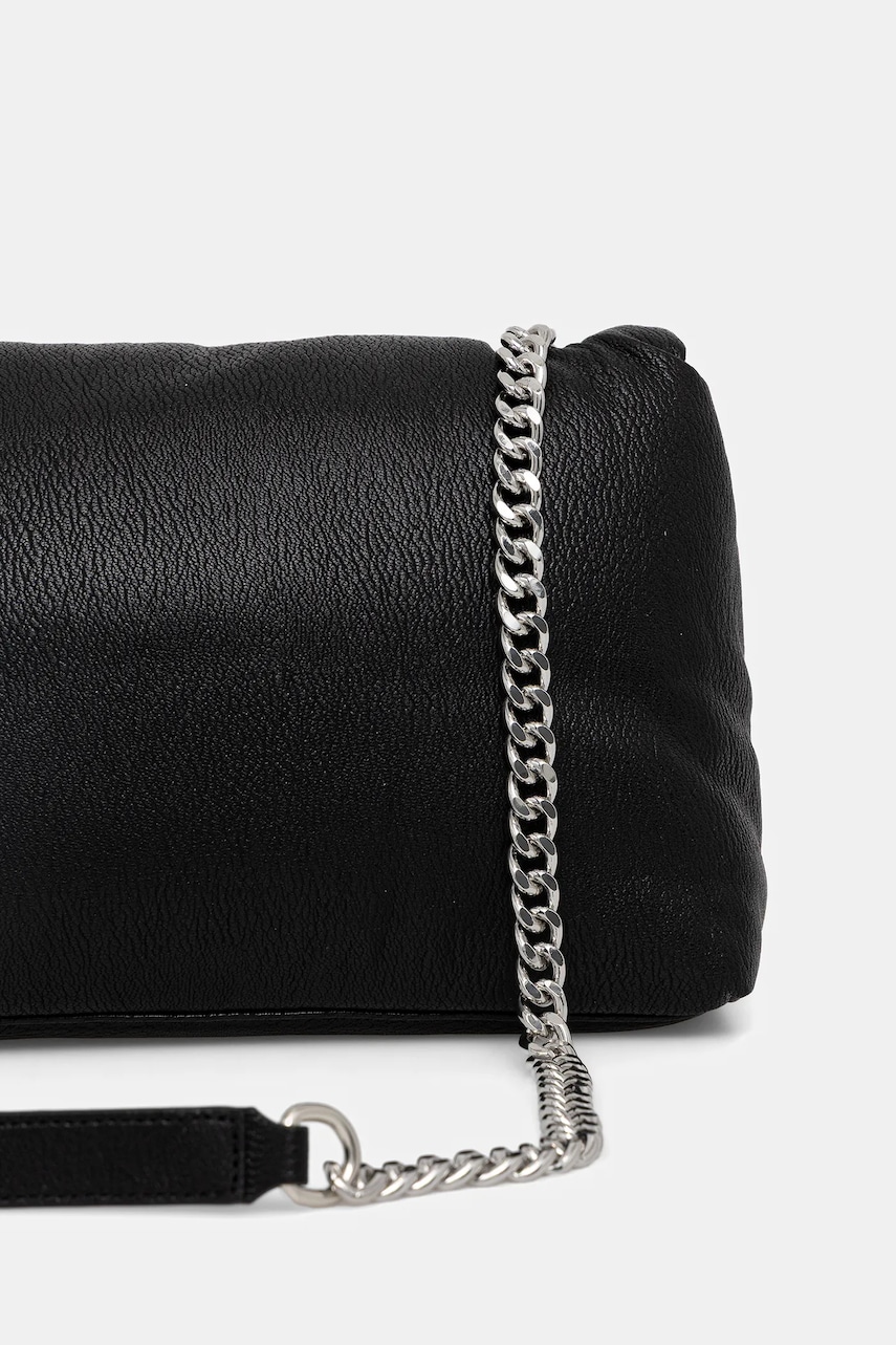 - Nie mieści formatu A4. - Klapa zapinana na zatrzask. - Posiada dwie przegrody. - Kieszonka wewnętrzna zapinana na suwak. - Łańcuch dopięty na stałe. - Dołączony tekstylny worek zabezpiecza produkt przed kurzem. - Głębokość: 10 cm. - Wysokość: 16,5 cm. - Szerokość u podstawy: 27 cm.