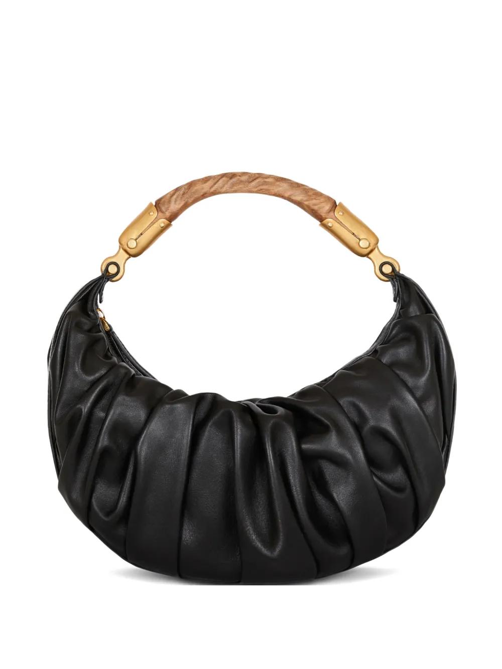 black leather pleated detailing gold-tone hardware top zip fastening curved silhouette wooden top handle