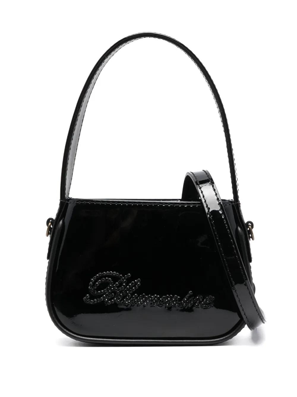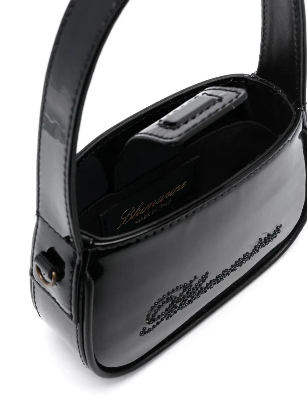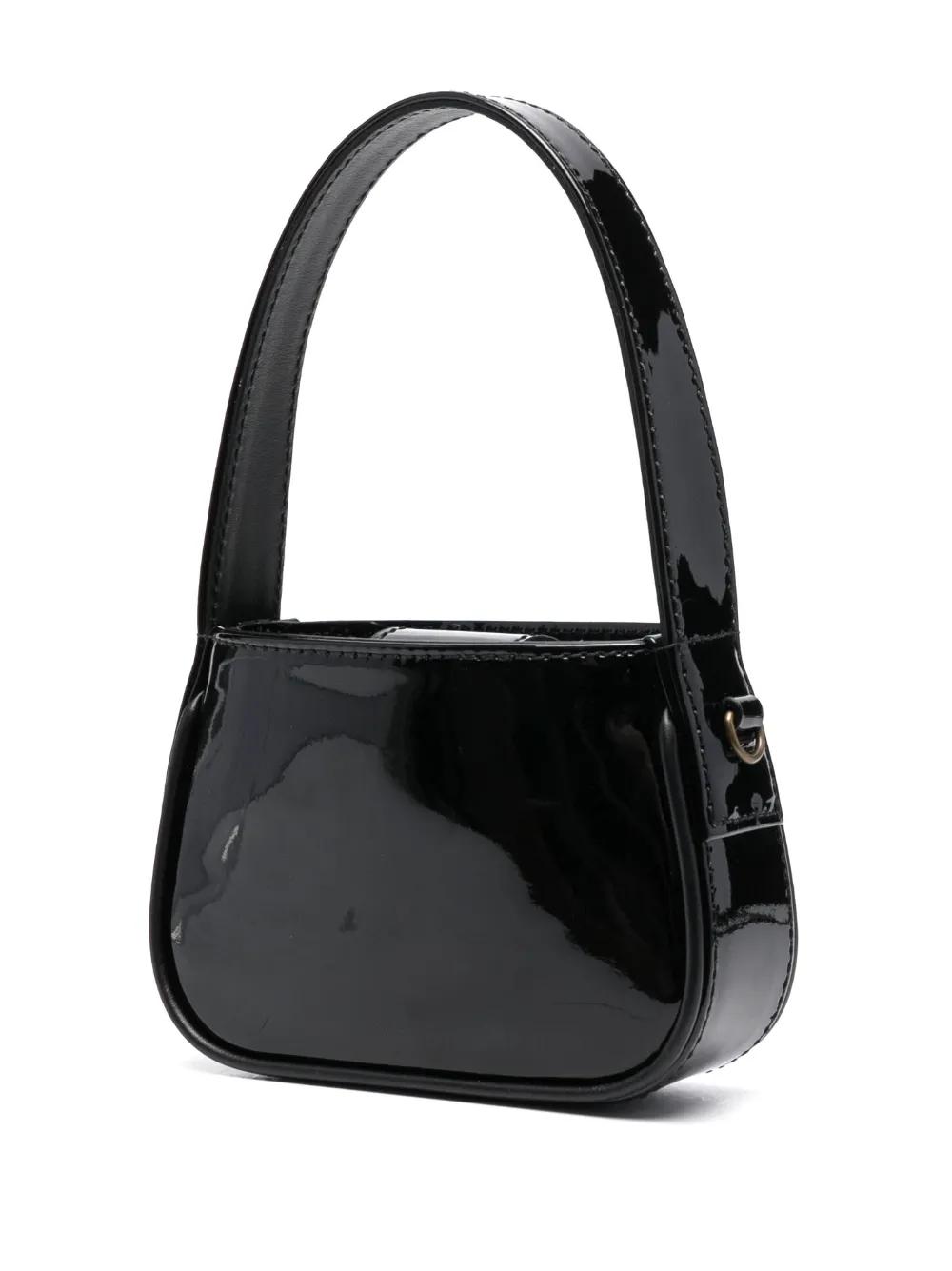 jet black calf leather cotton patent finish internal logo patch magnetic strap fastening single top handle detachable shoulder strap main compartment