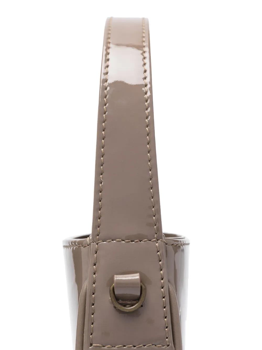 taupe brown calf leather patent finish glass crystal embellishment logo embellishment internal logo patch magnetic strap fastening single top handle detachable shoulder strap main compartment