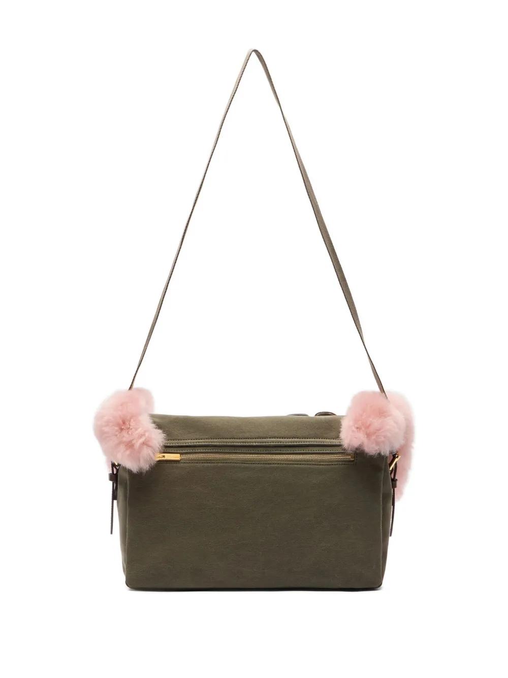 olive green fur trim embroidered logo button detailing gold-tone hardware adjustable shoulder strap