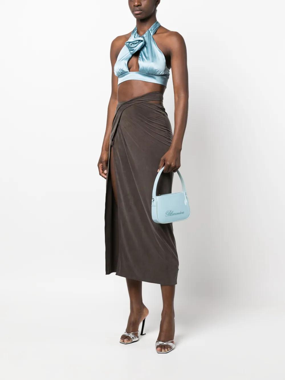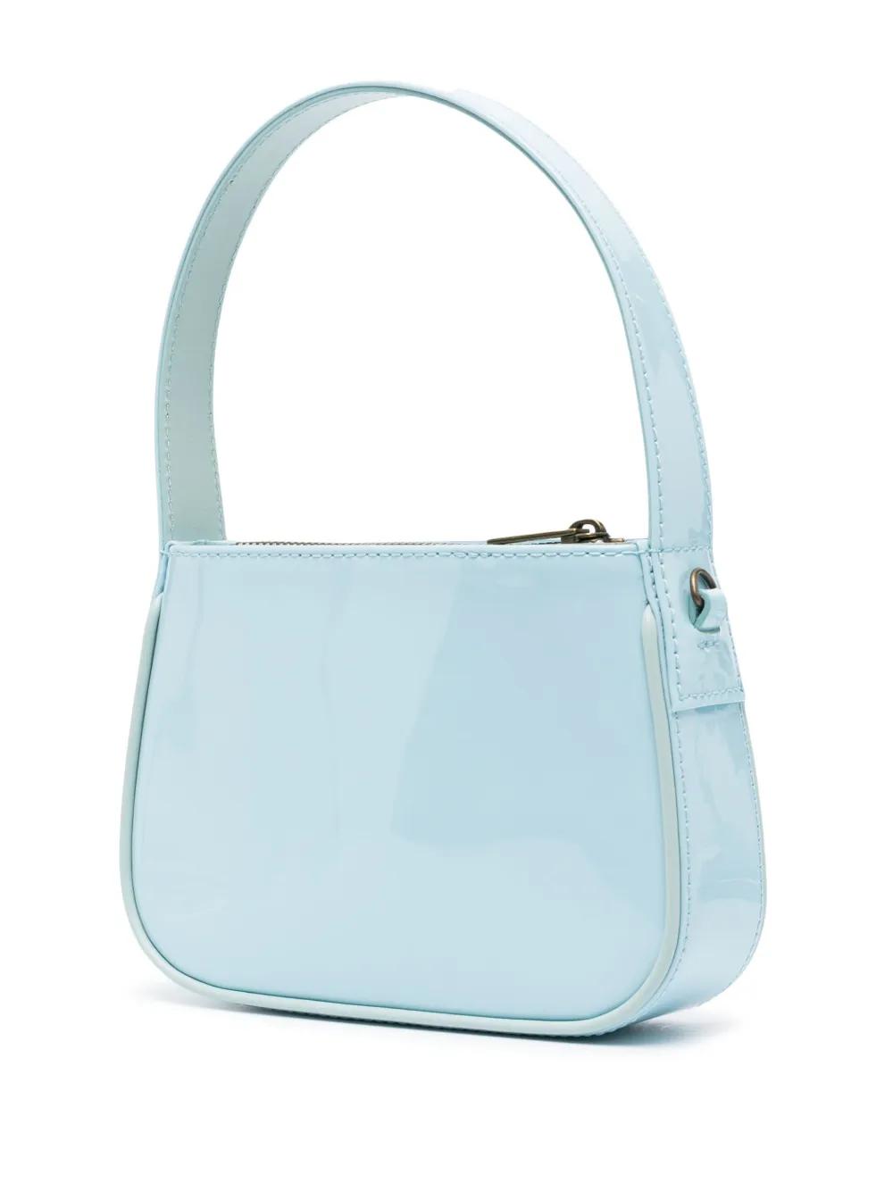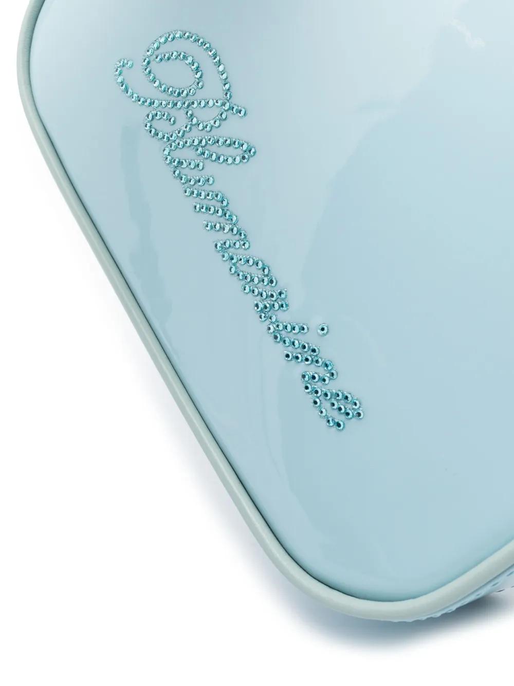 baby blue calf leather appliqué logo rhinestone embellishment single circular top handle top zip fastening main compartment internal logo patch