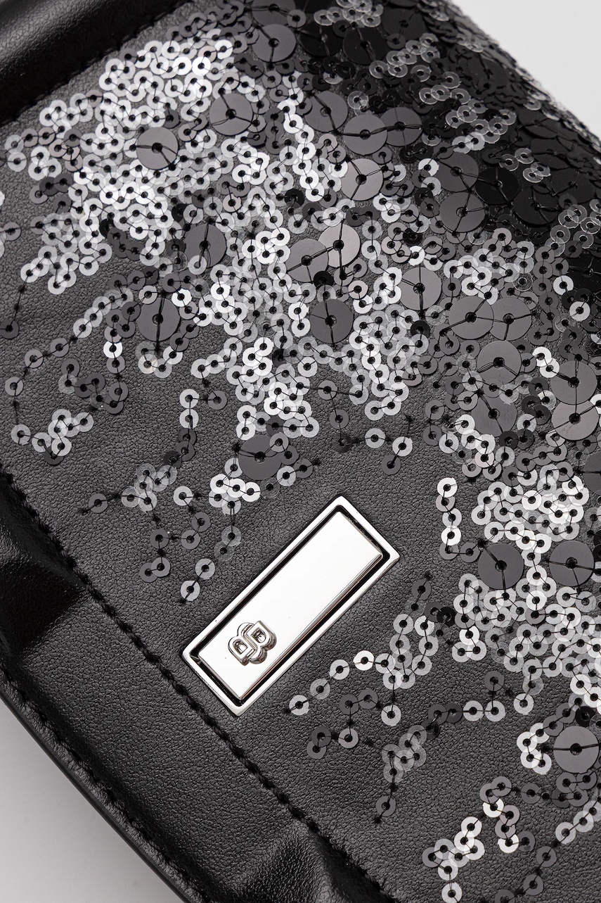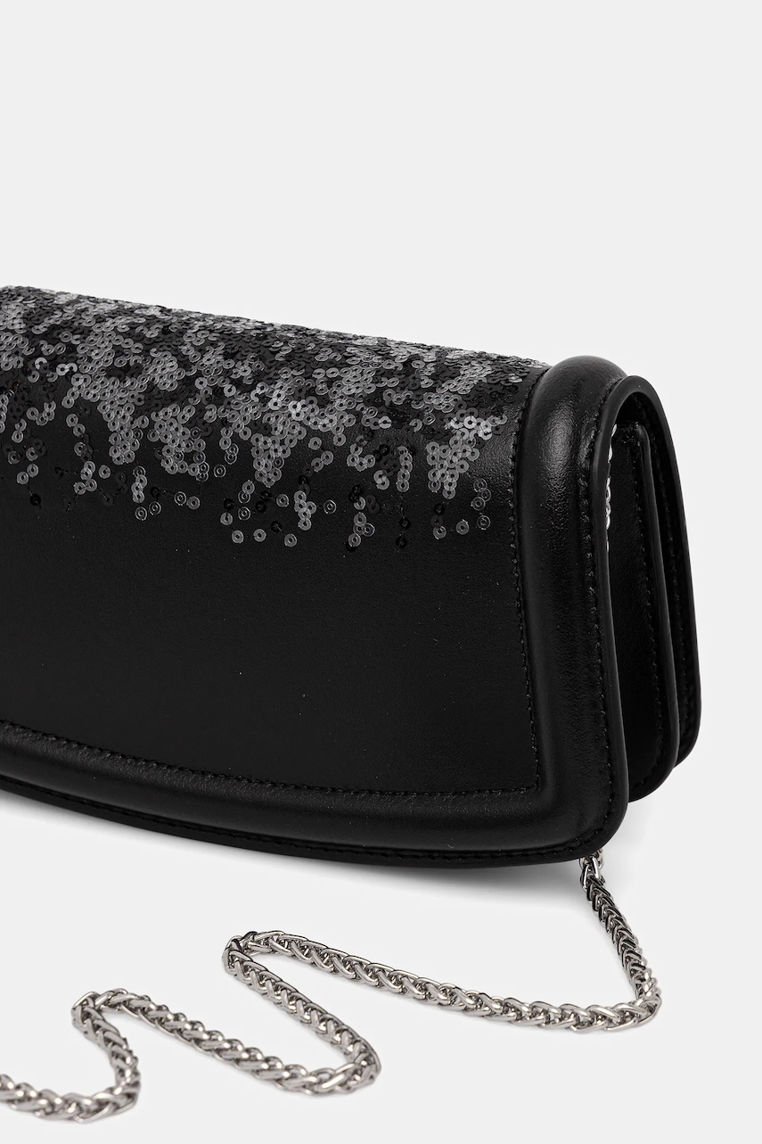 - Klapa zapinana na magnes. - Posiada dwie przegrody. - Kieszonka wewnętrzna zapinana na suwak. - Nie mieści formatu A4. - Model z podszewką. - Odpinany pasek bez regulacji. - Dołączony tekstylny worek zabezpiecza produkt przed kurzem. - Model z ozdobną aplikacją z cekinów. - Długość paska: 106 cm. - Głębokość: 5 cm. - Wysokość: 12 cm. - Szerokość u podstawy: 18 cm.