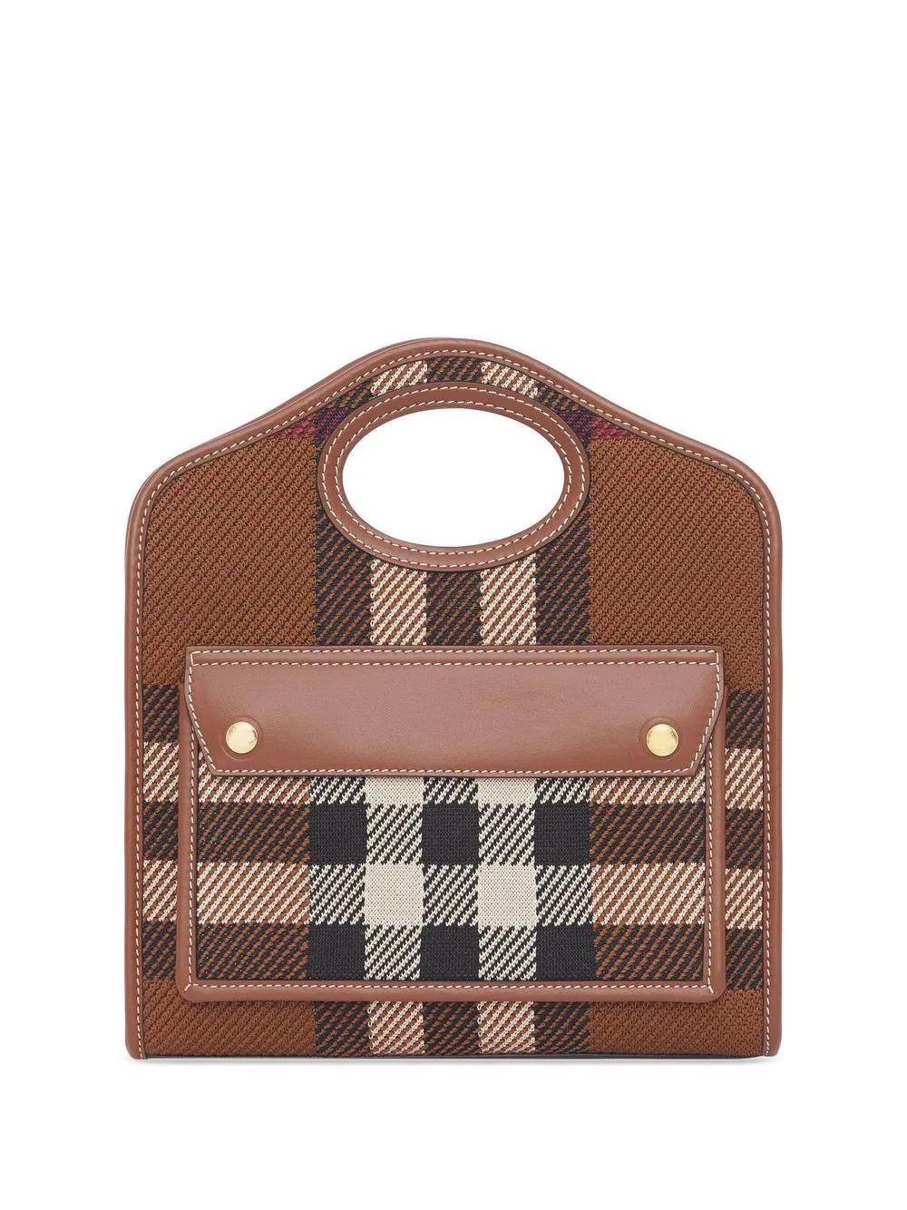 dark birch brown leather trim knitted panels house check pattern contrast stitching gold-tone hardware cut-out top handle front flap pocket internal zip-fastening pocket adjustable detachable shoulder strap