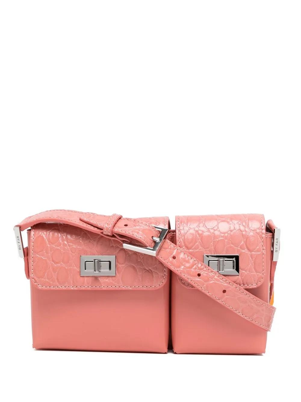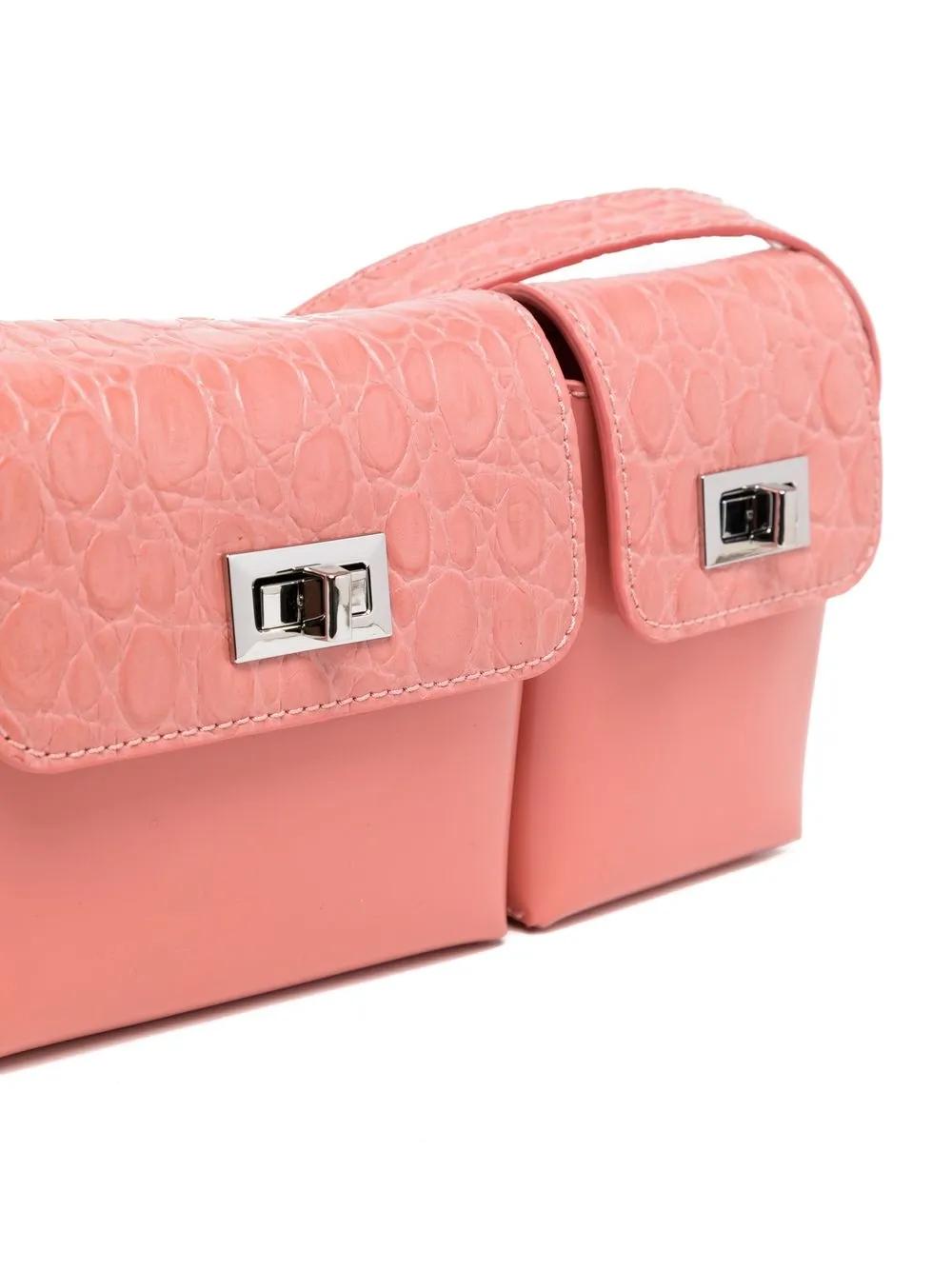 salmon pink leather silver-tone hardware twist-lock fastening foldover top adjustable detachable shoulder strap two main compartments internal slip pocket