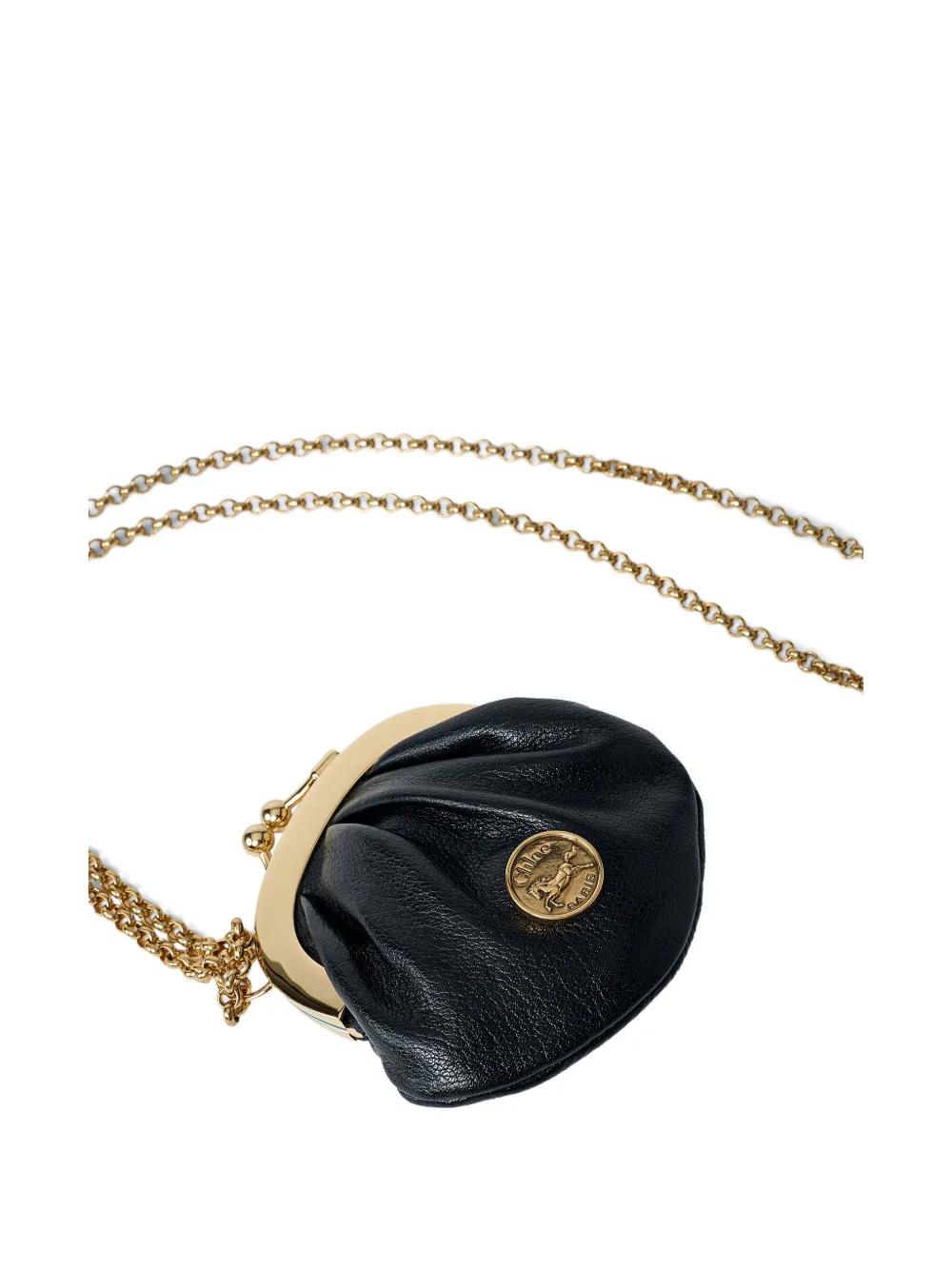 black smooth-grain finish gold-tone hardware chain strap top clasp fastening front logo engraved motif