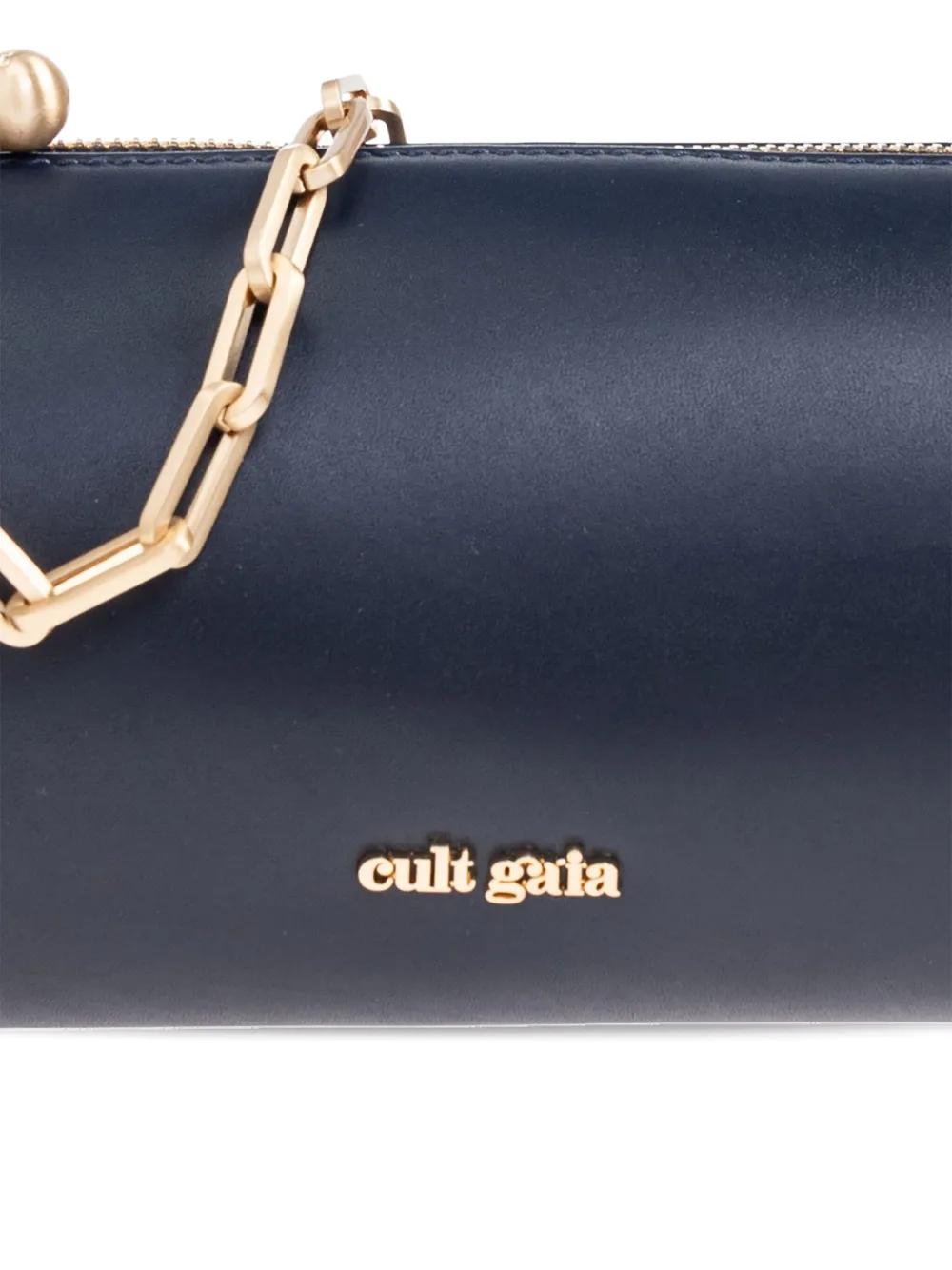 dark blue leather cylindrical shape gold-tone chain strap zip fastening logo-plaque