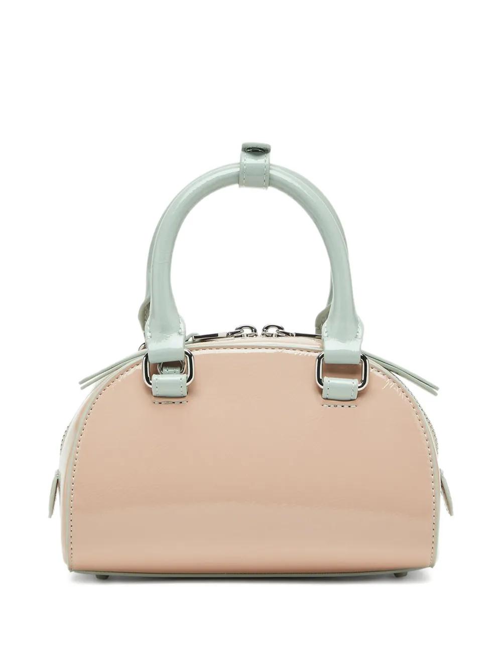 light pink embossed logo top handle detachable strap two-way zip fastening metal feet