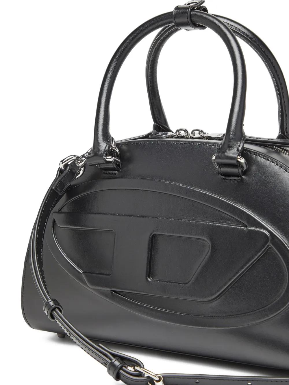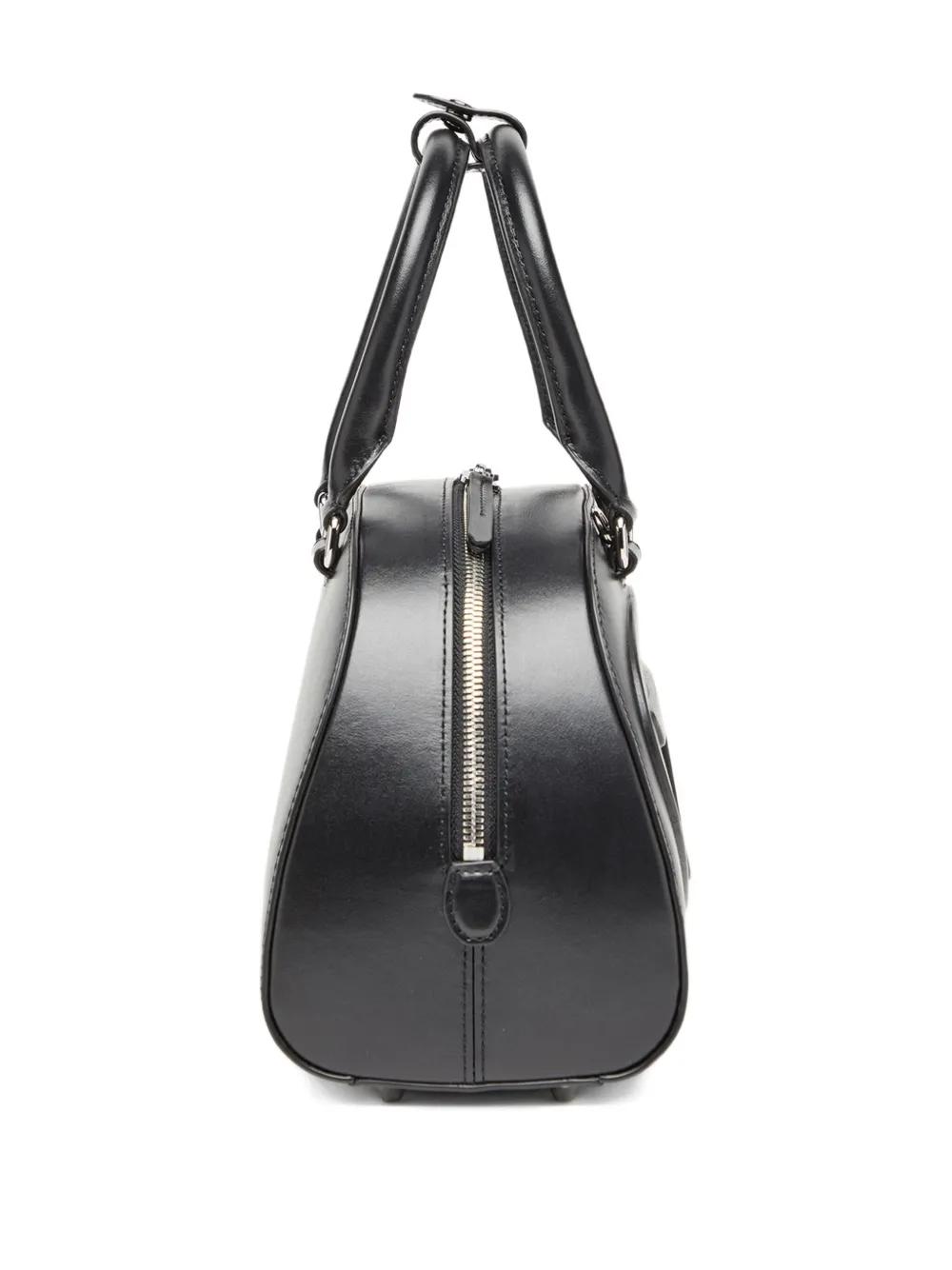 black two-way zip fastening two rolled top handles adjustable detachable shoulder strap embossed logo to the front
