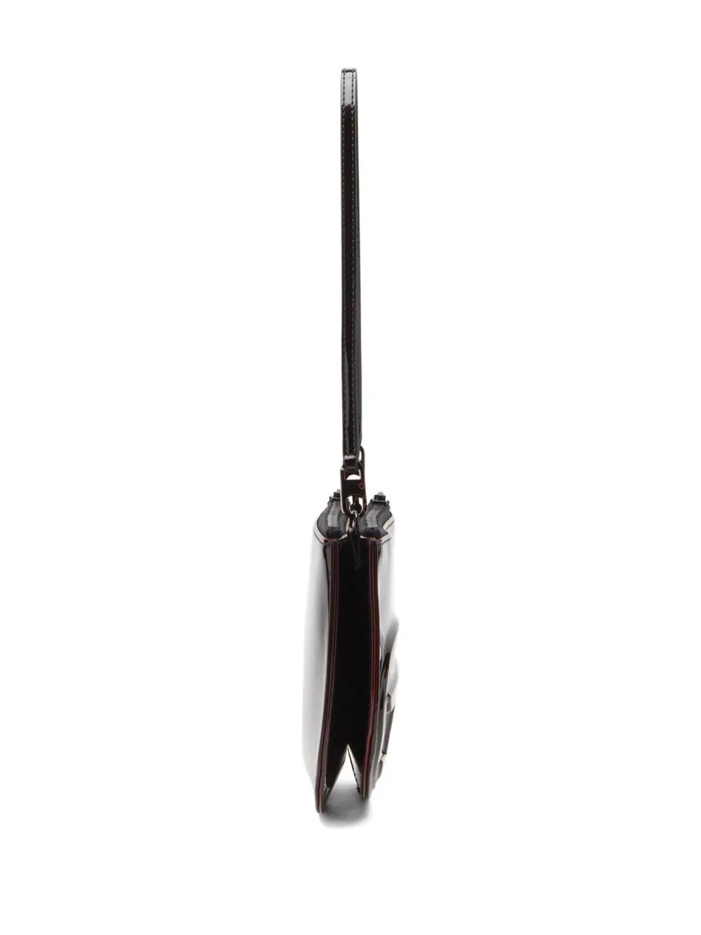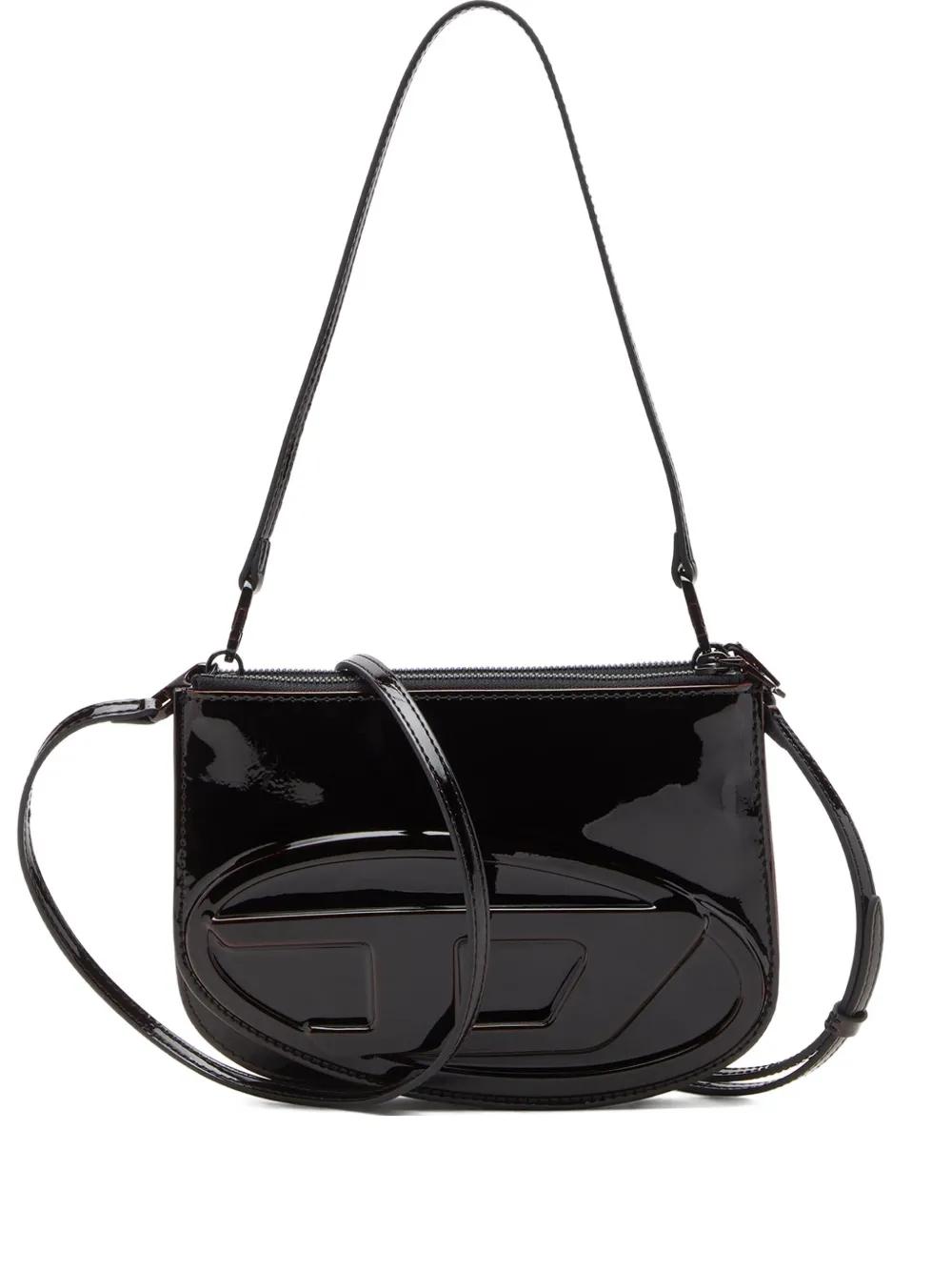 black patent finish embossed logo top handle zip fastening detachable shoulder strap