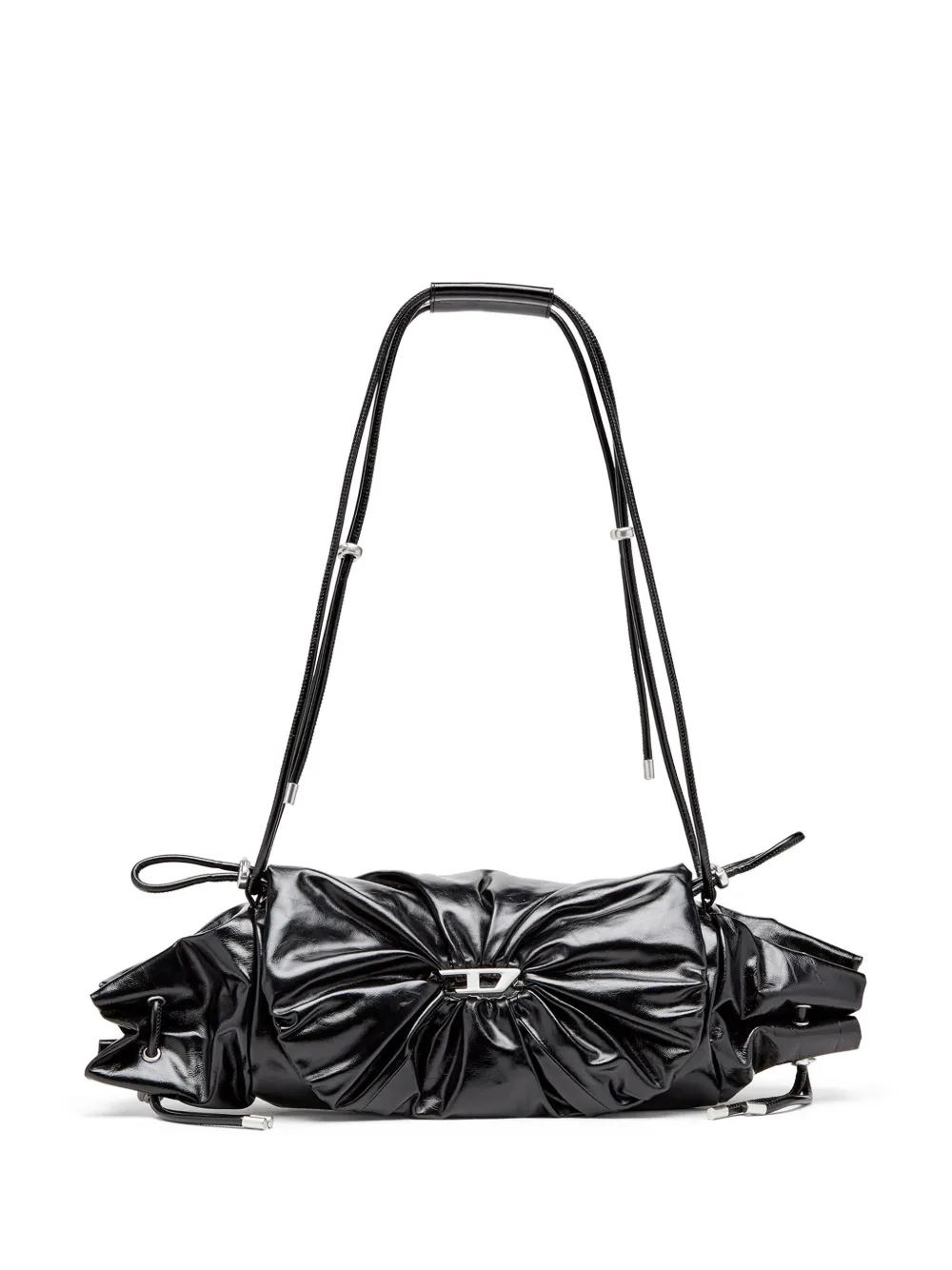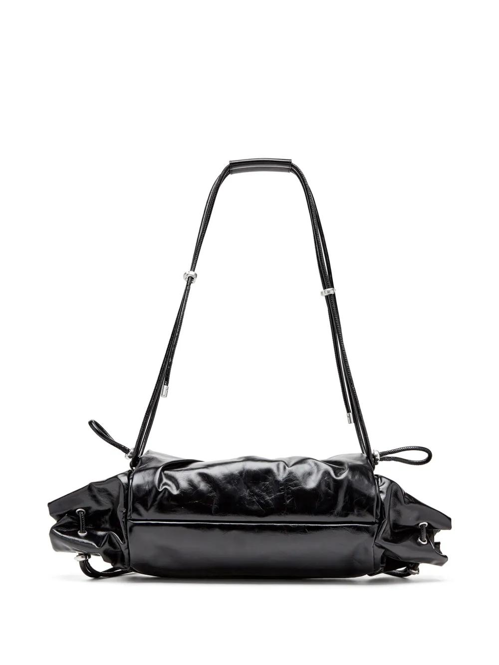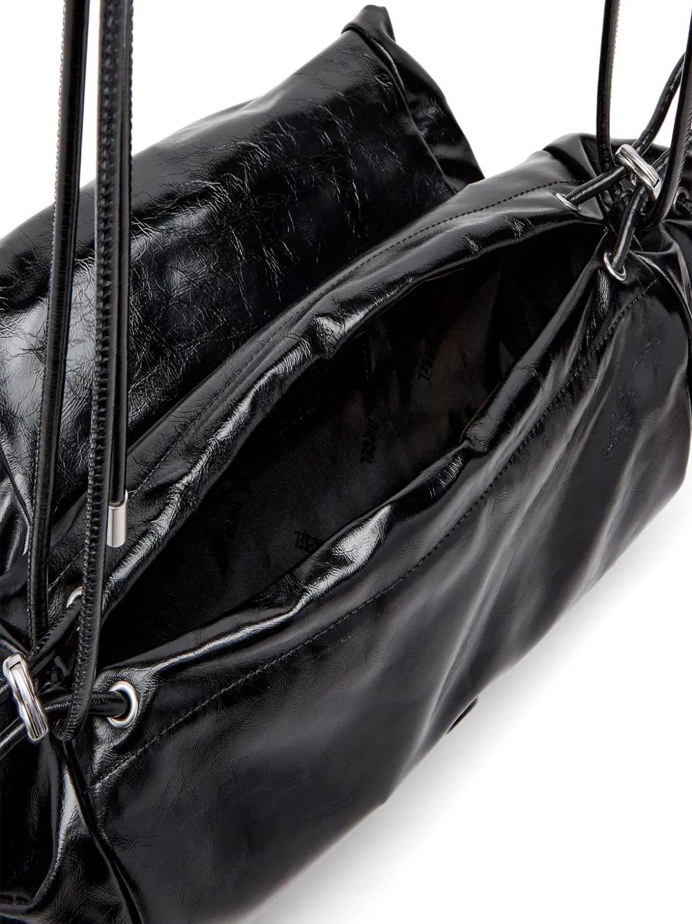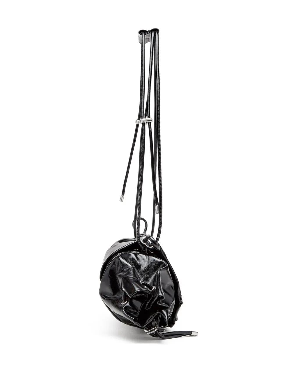 black calf leather high-shine finish gathered detailing tie-fastening straps logo plaque foldover top top drawstring fastening main compartment