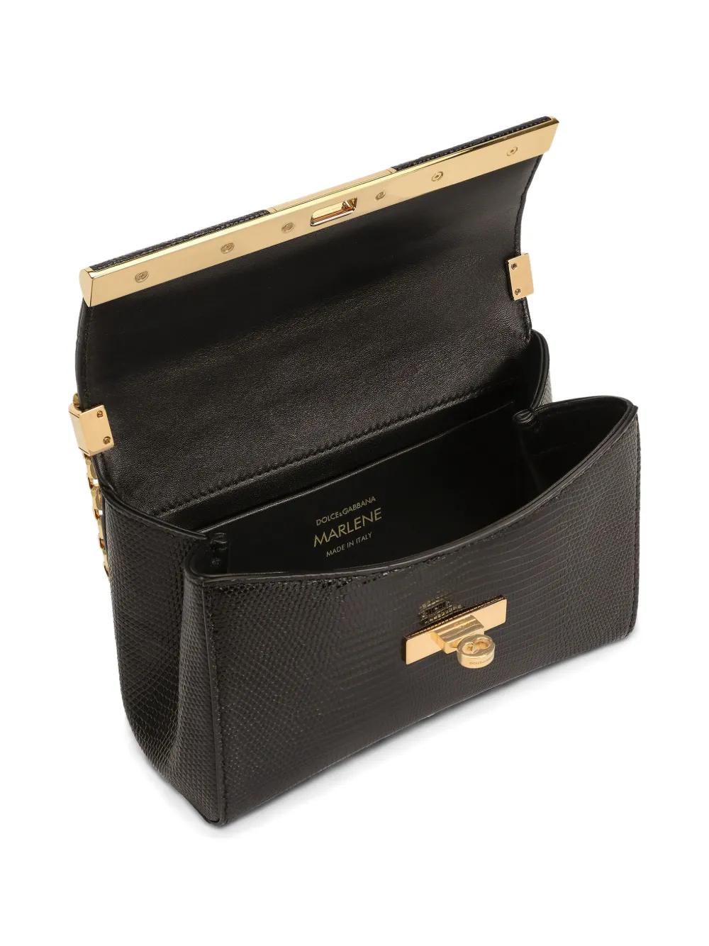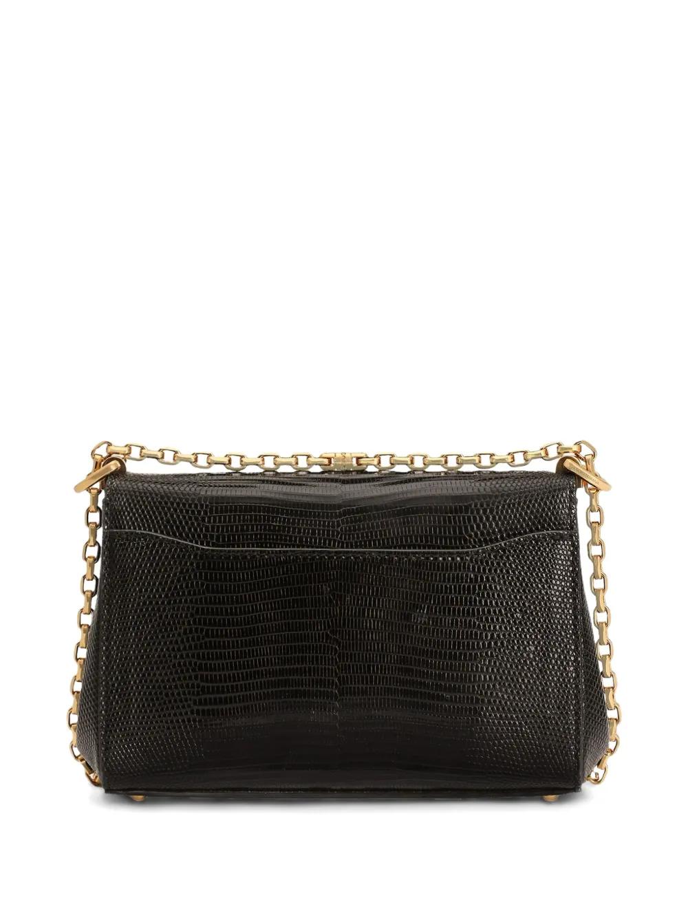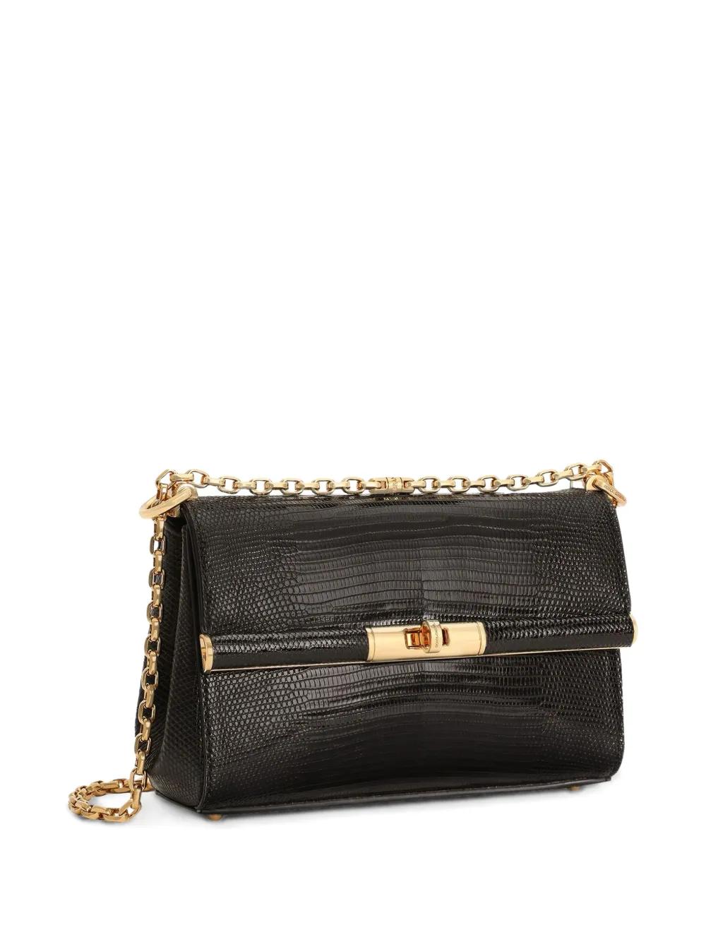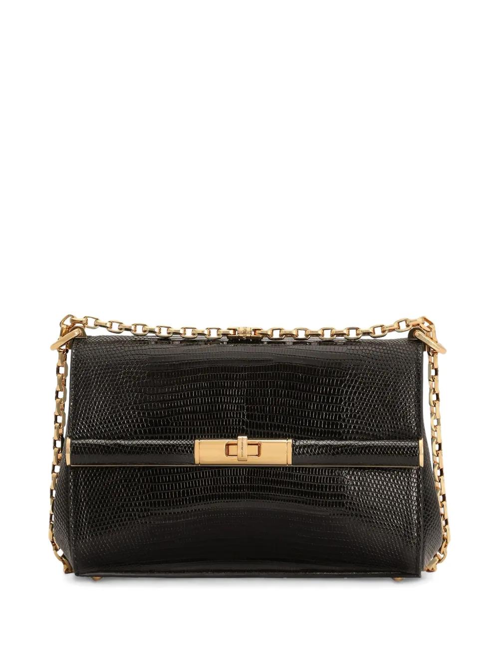 black twist-lock fastening embossed crocodile effect foldover top chain-link shoulder strap
