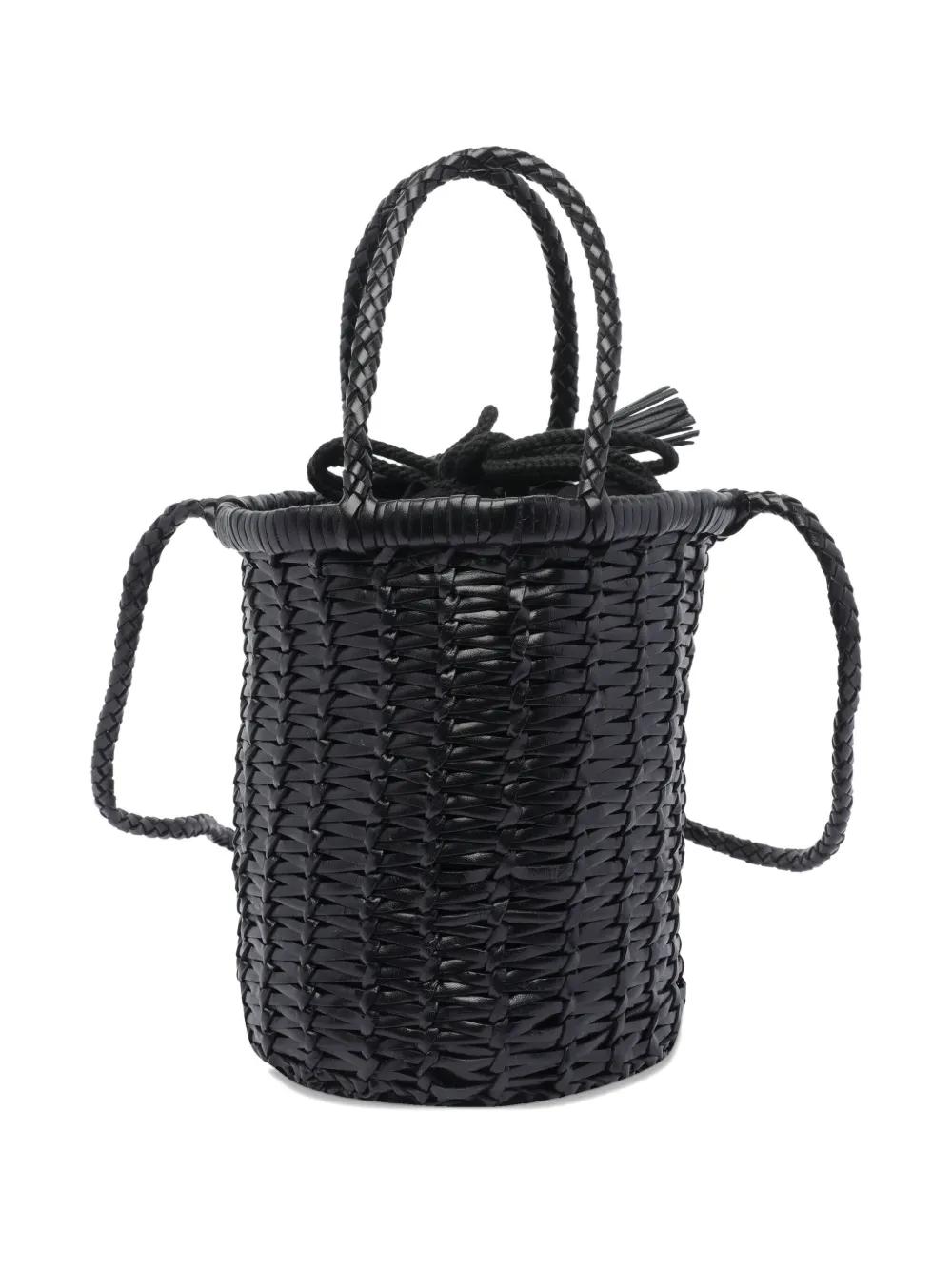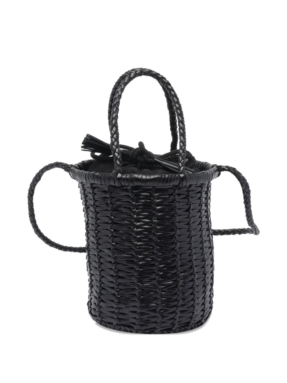 black woven leather cylindrical shape drawstring closure braided leather handles tassel detail