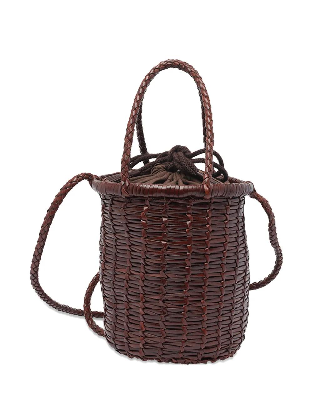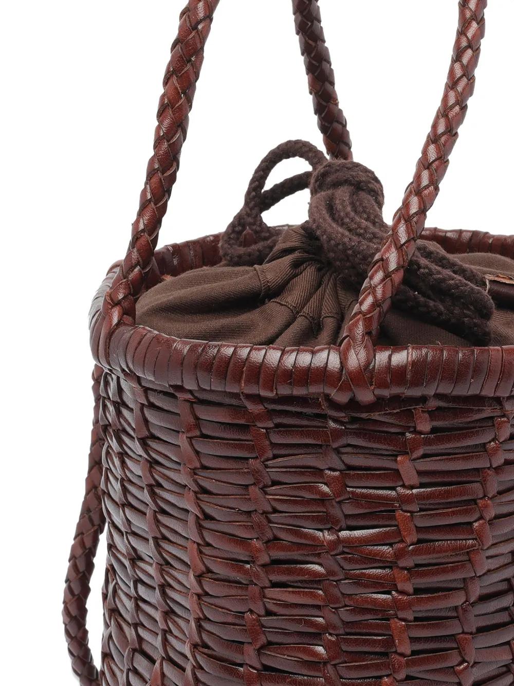 brown woven leather drawstring closure braided leather top handle braided leather shoulder strap cylindrical shape