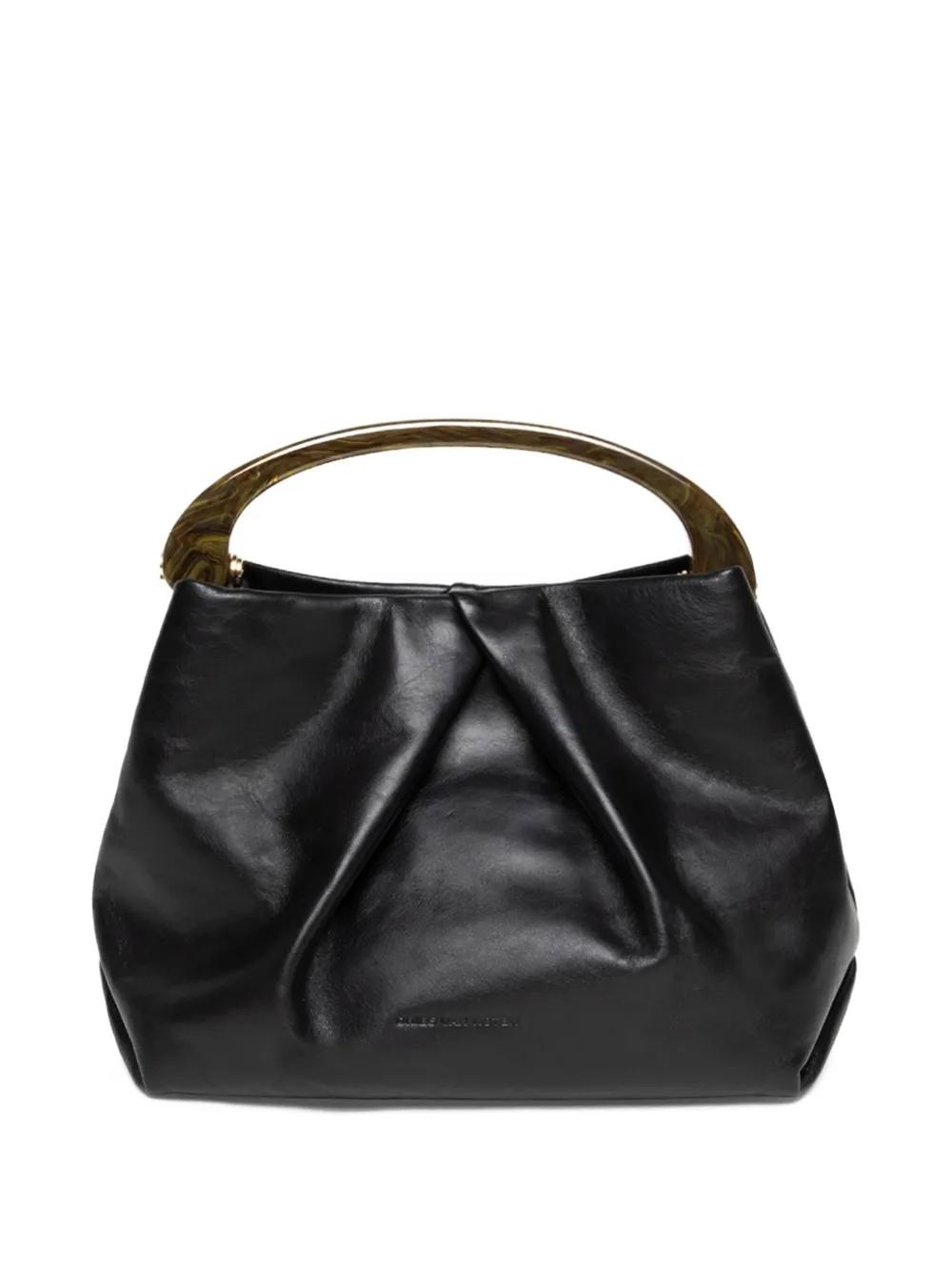 black pleated detailing leather construction top handle detachable shoulder strap curved handle