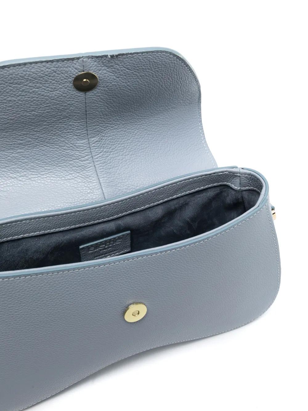 blue-grey leather pebbled texture tonal stitching adjustable detachable shoulder strap foldover top with magnetic fastening main compartment internal logo patch