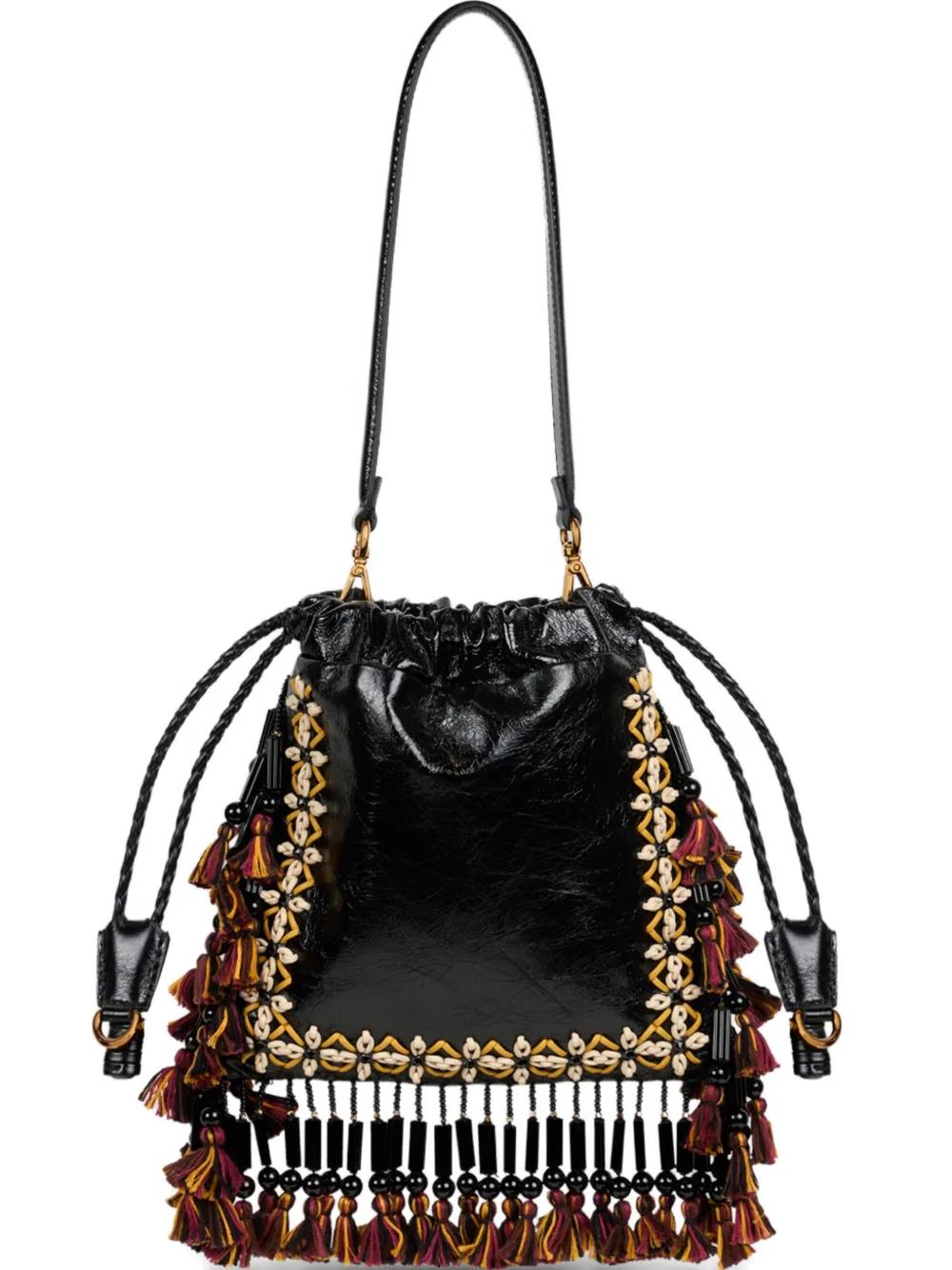 black floral embellishment bead embellishment fringed detail drawstring fastening top handle