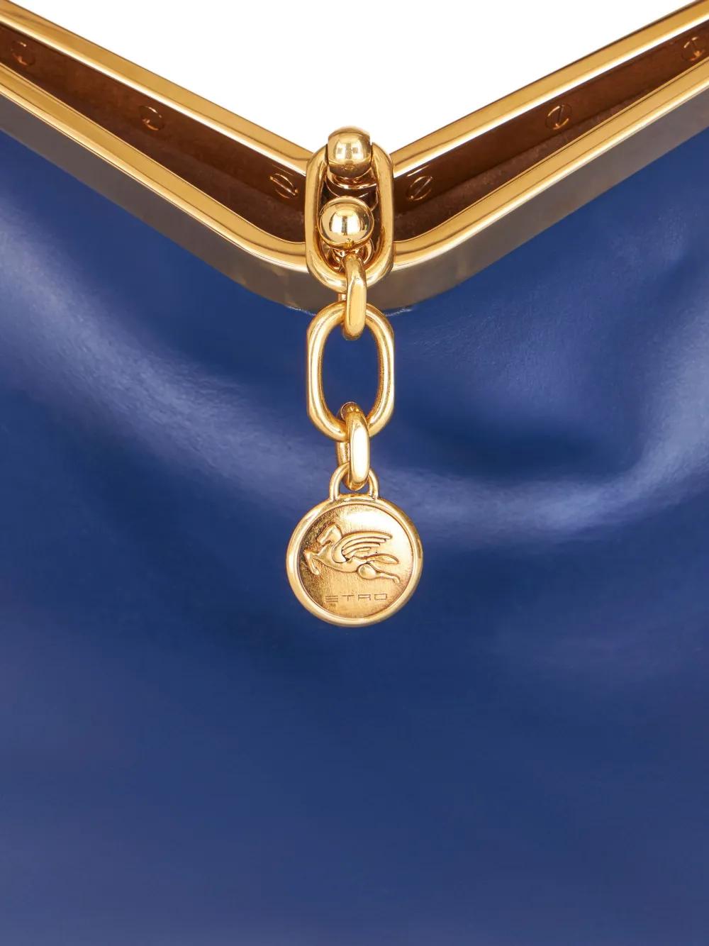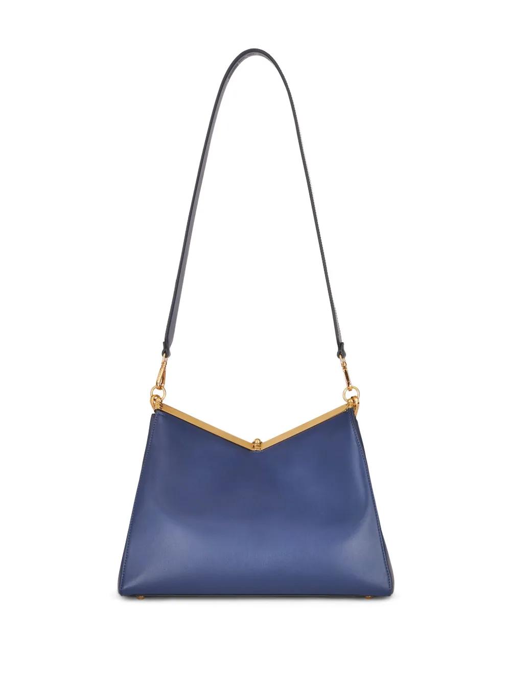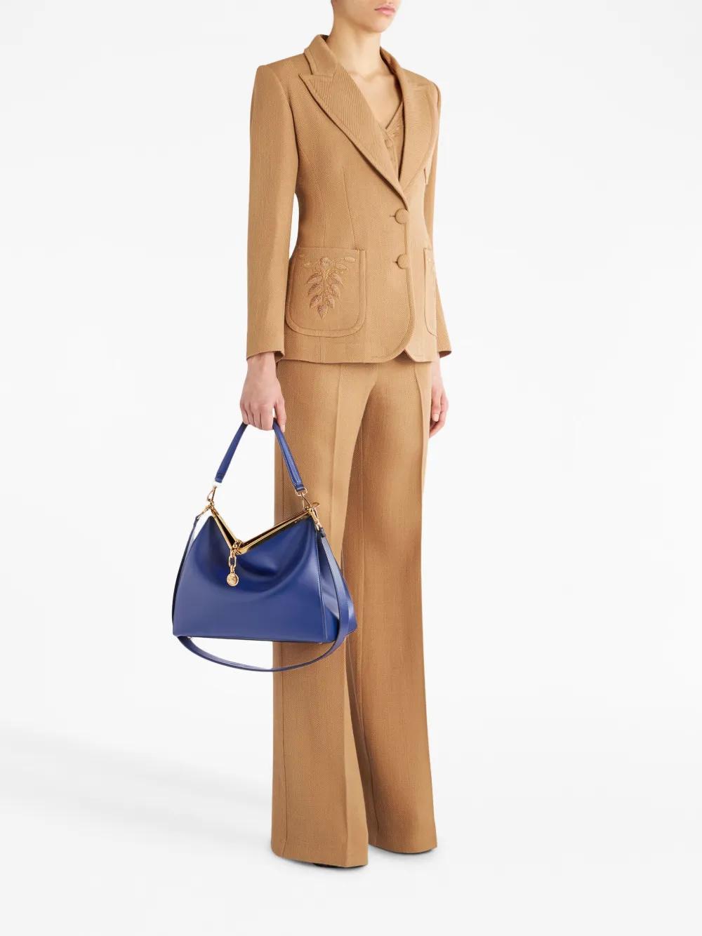 cerulean blue calf leather smooth grain gold-tone logo plaque signature Pegaso motif tonal stitching metal feet gold-tone hardware clasp fastening detachable shoulder strap detachable top handles removable pouch main compartment