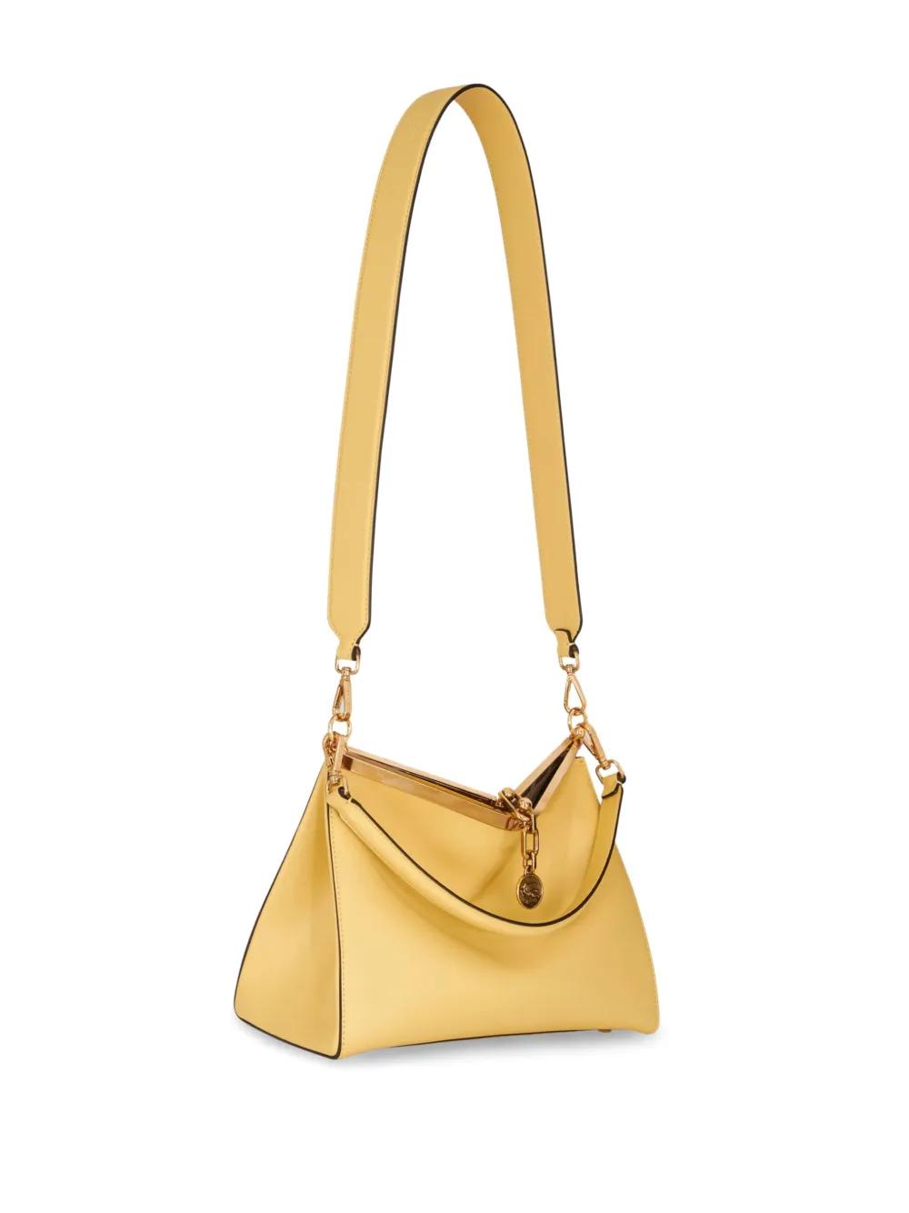 yellow calf leather smooth grain signature Pegaso motif logo charm top clasp fastening two adjustable detachable shoulder straps main compartment removable pouch metal feet full lining gold-tone hardware