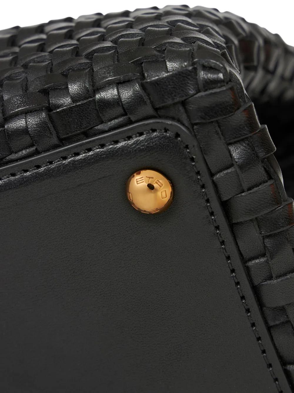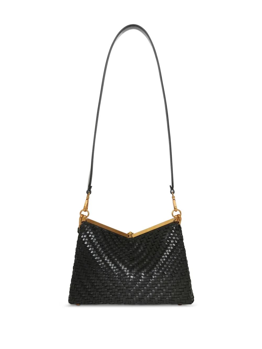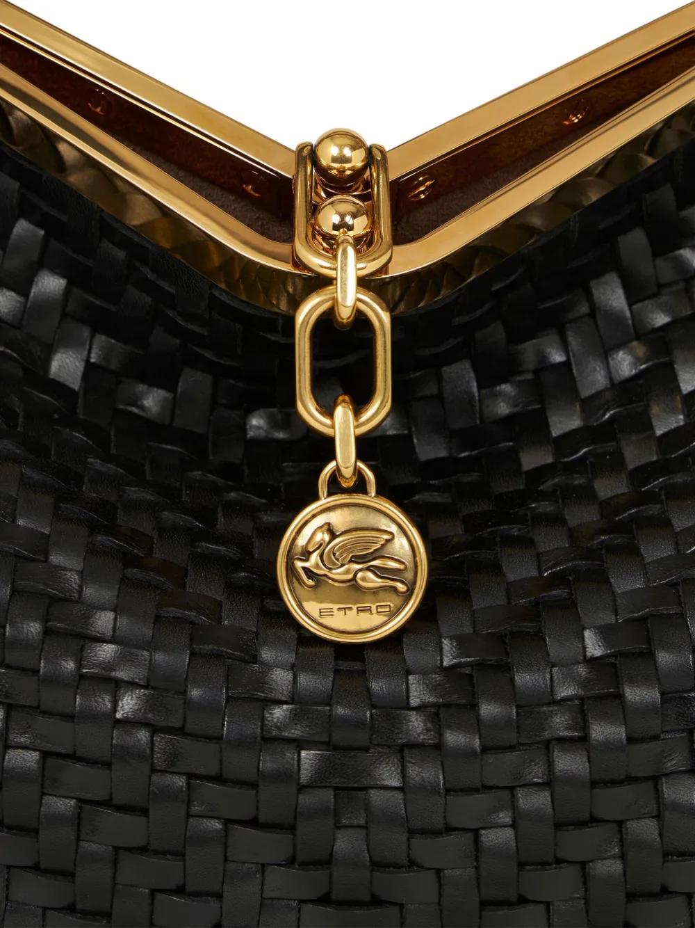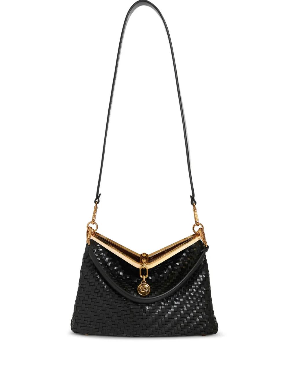 black leather interwoven design clasp fastening gold-tone hardware signature Pegaso motif single detachable top handle adjustable detachable shoulder strap main compartment removable pouch suede lining