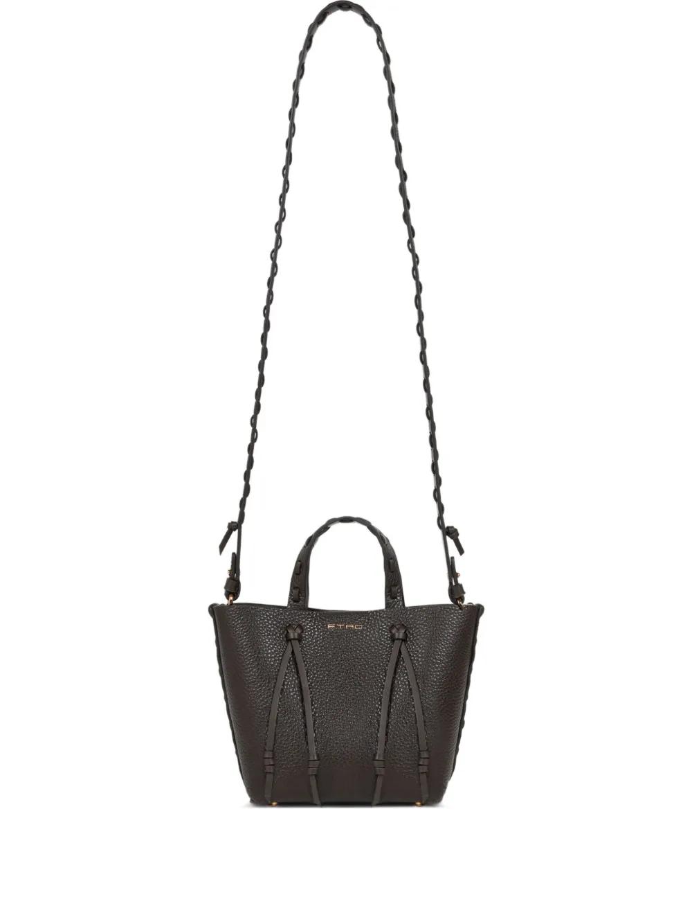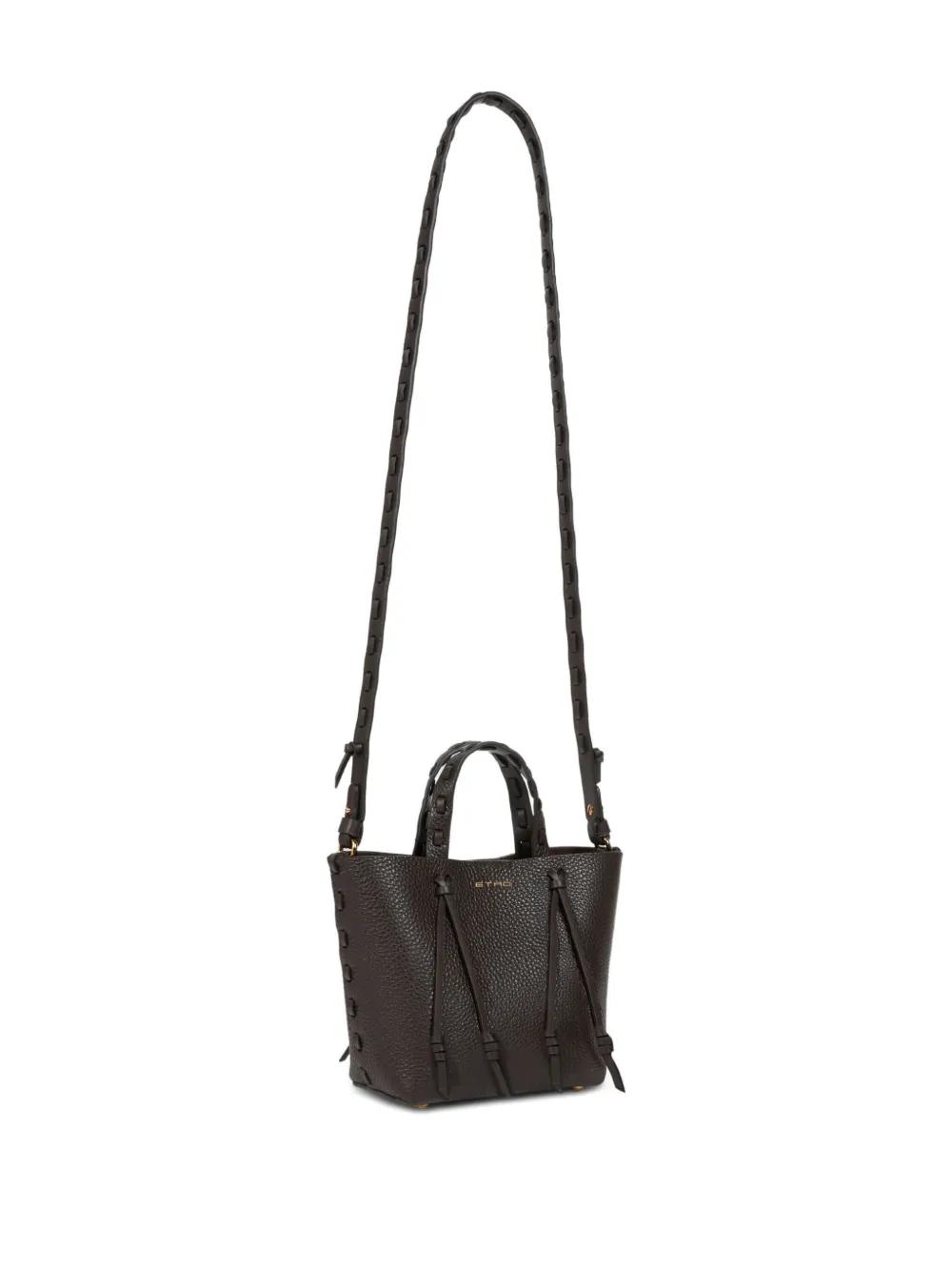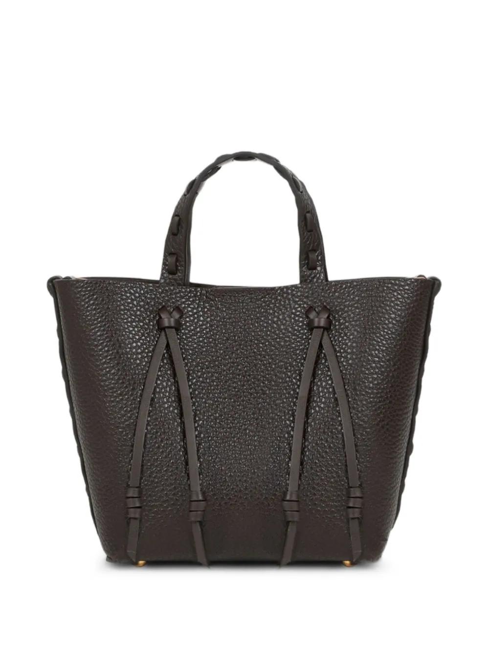 dark brown pebble leather stitched detailing two top handles detachable shoulder strap concealed magnetic fastening