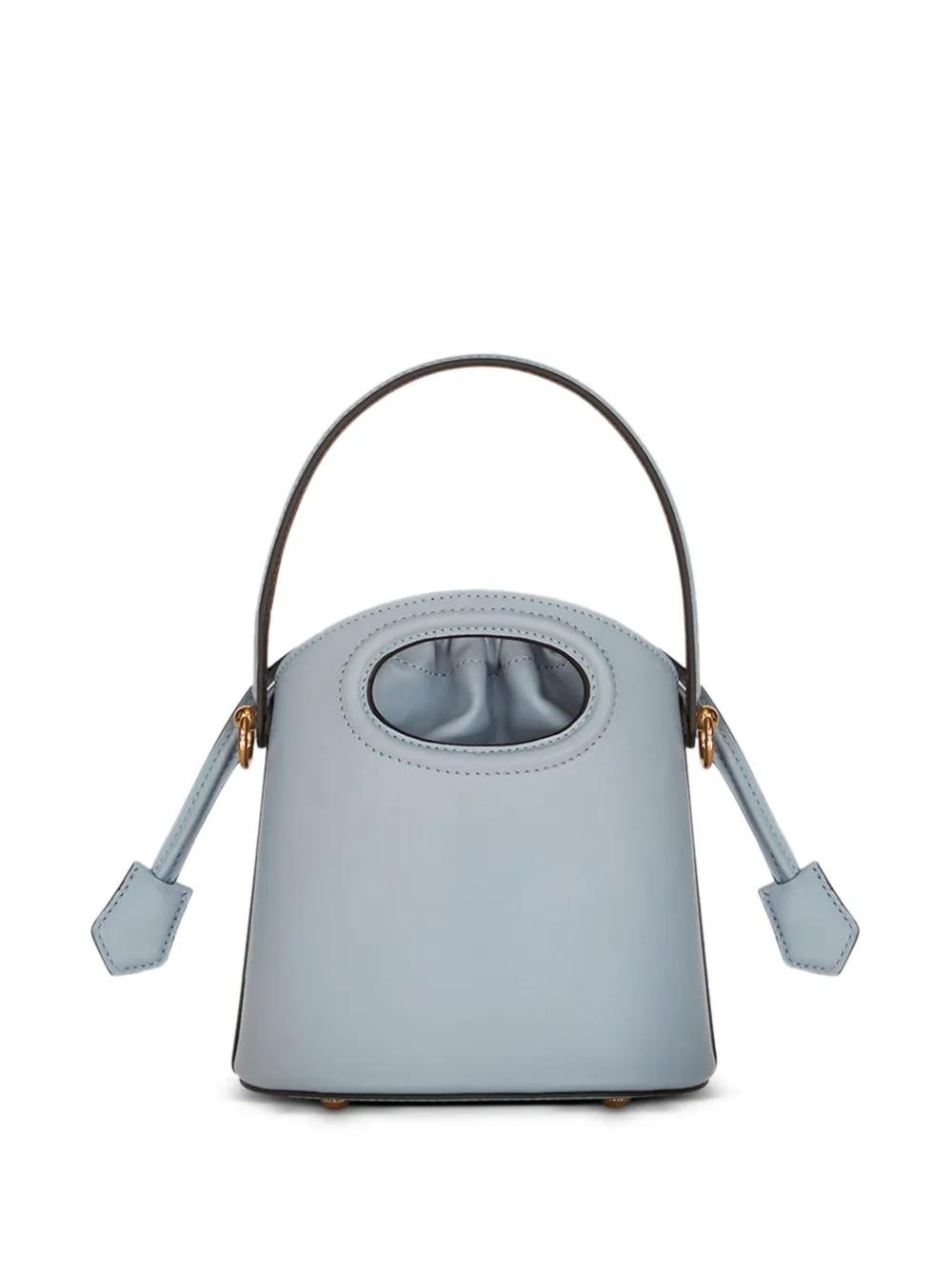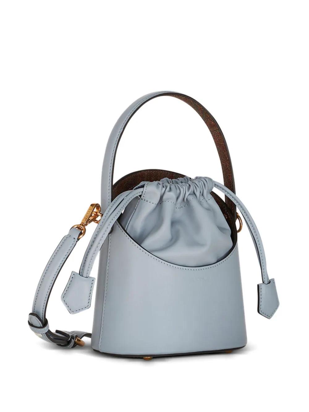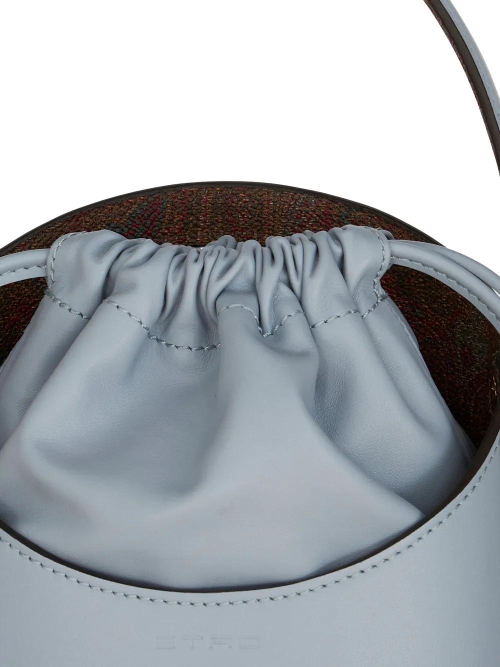 sky blue leather gold-tone hardware debossed logo to the front paisley print bucket body top drawstring fastening adjustable shoulder strap single top handle cut-out top handle main compartment internal logo appliqué internal patch pocket metal feet