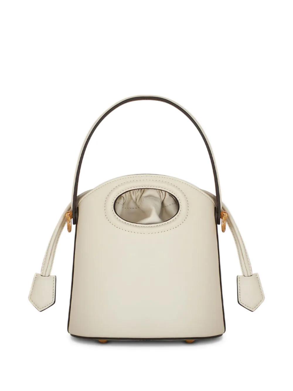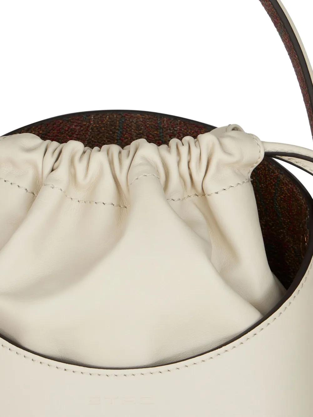 cream white leather gold-tone hardware debossed logo to the front paisley print bucket body top drawstring fastening adjustable shoulder strap single top handle cut-out top handle main compartment internal logo appliqué internal patch pocket metal feet