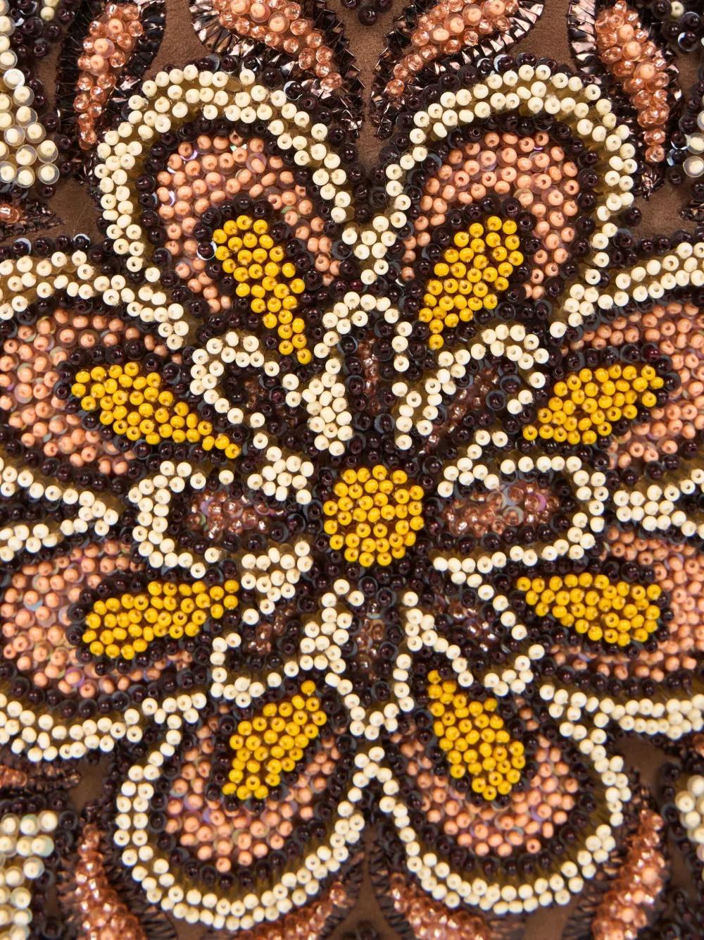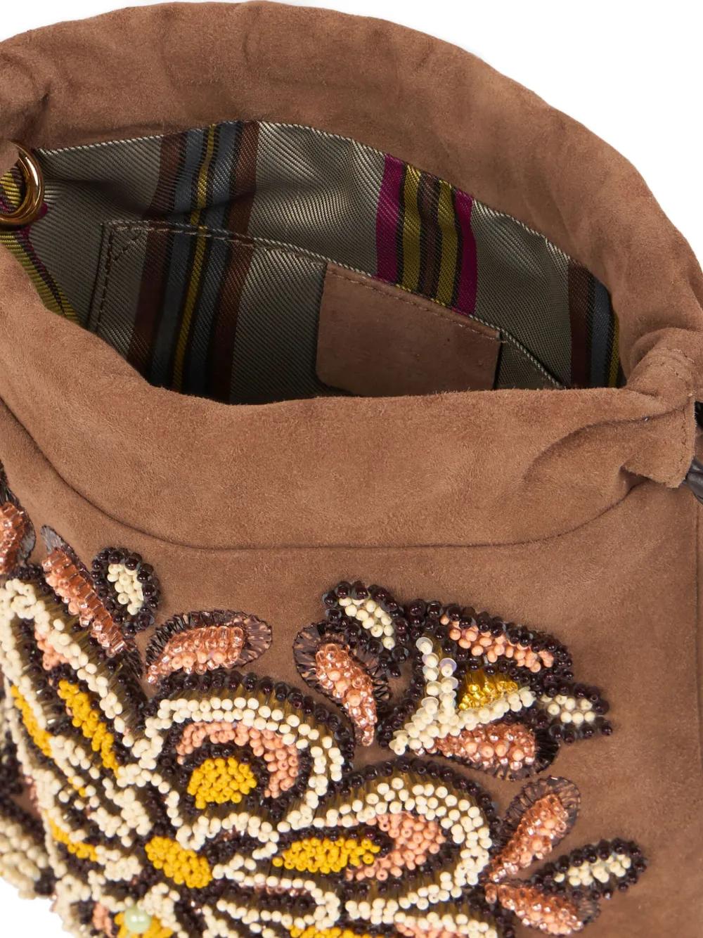 brown beaded embellishment drawstring fastening top handle floral pattern