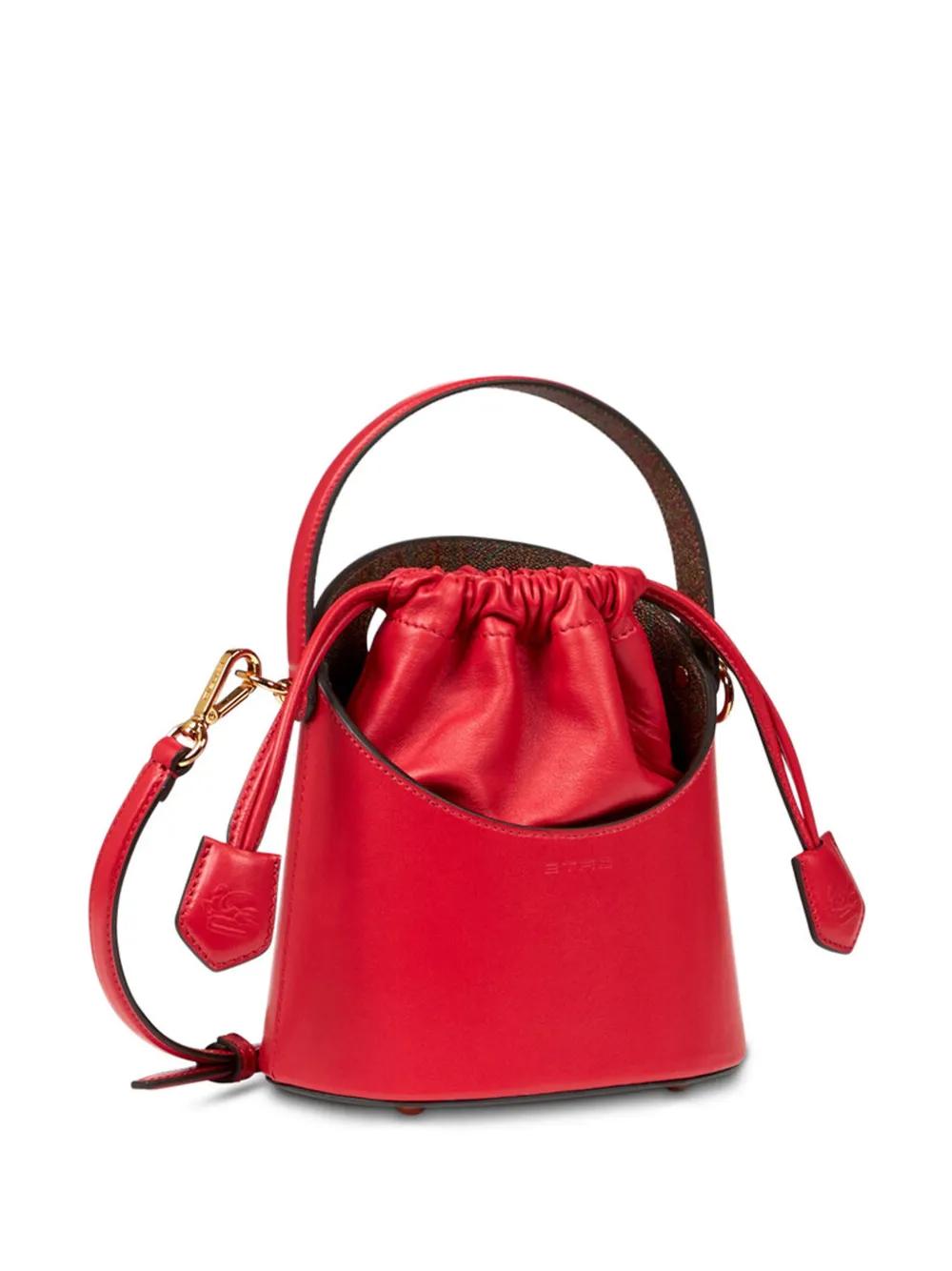 bright red calf leather bucket body double layer single flat top handle adjustable detachable shoulder strap cut-out top handle logo-engraved gold-tone hardware debossed logo to the front main compartment internal patch pocket paisley print full lining top drawstring fastening
