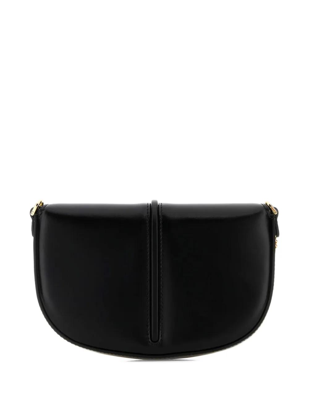 black leather chain-link shoulder strap gold-tone hardware logo lettering