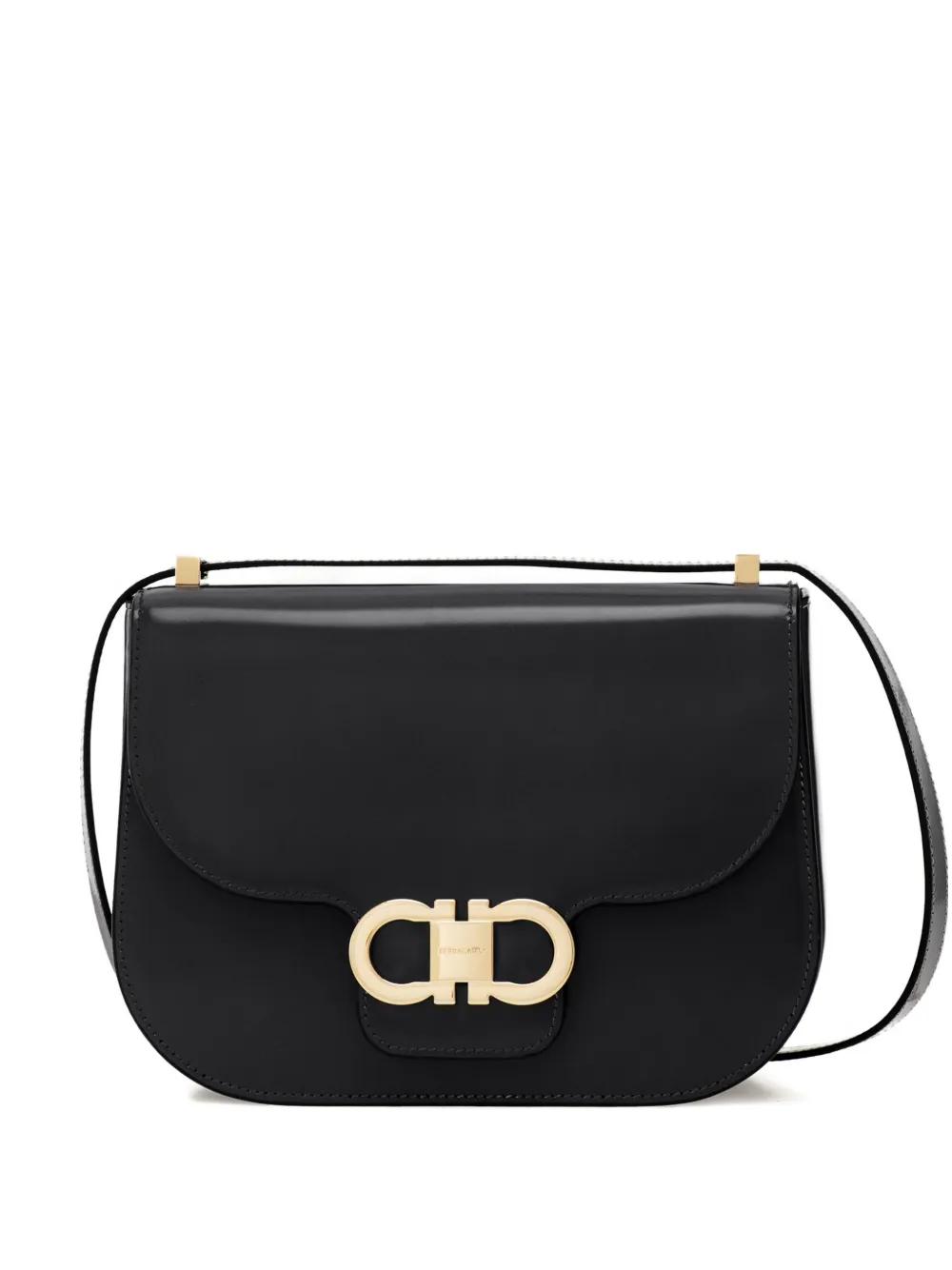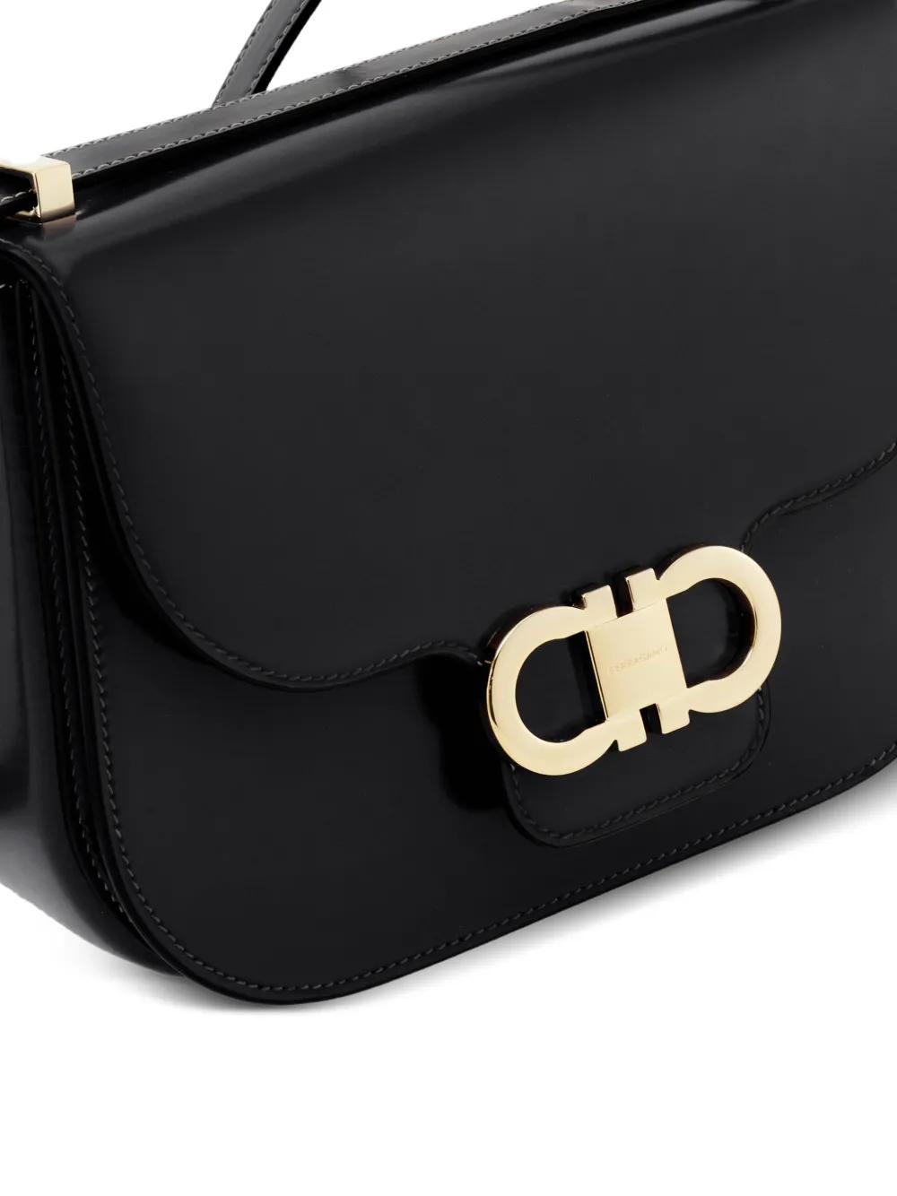 black hammered finish gancini clasp adjustable shoulder strap slit pocket curved front flap