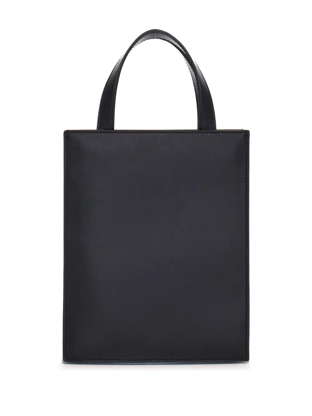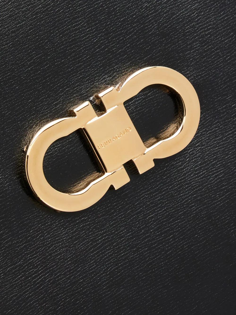 black calf leather smooth grain rectangle body two flat top handles adjustable shoulder strap signature Gancio logo plaque main compartment internal patch pocket internal logo stamp contrast lining gold-tone hardware magnetic fastening