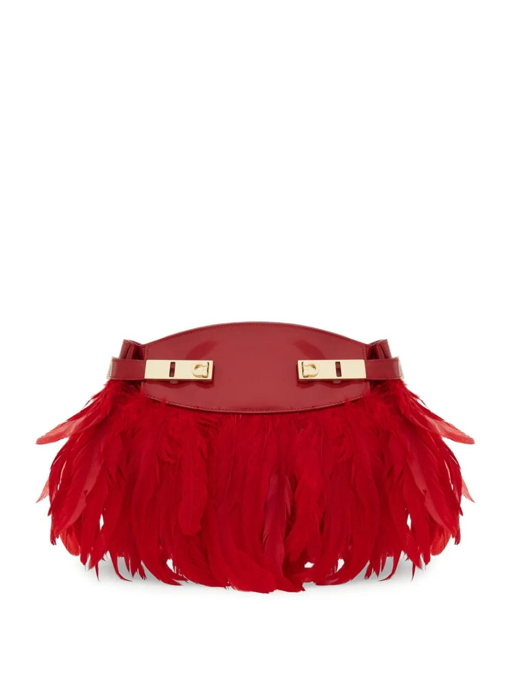 red calfskin leather feather embellishment Gancini buckle fastening magnetic clasp