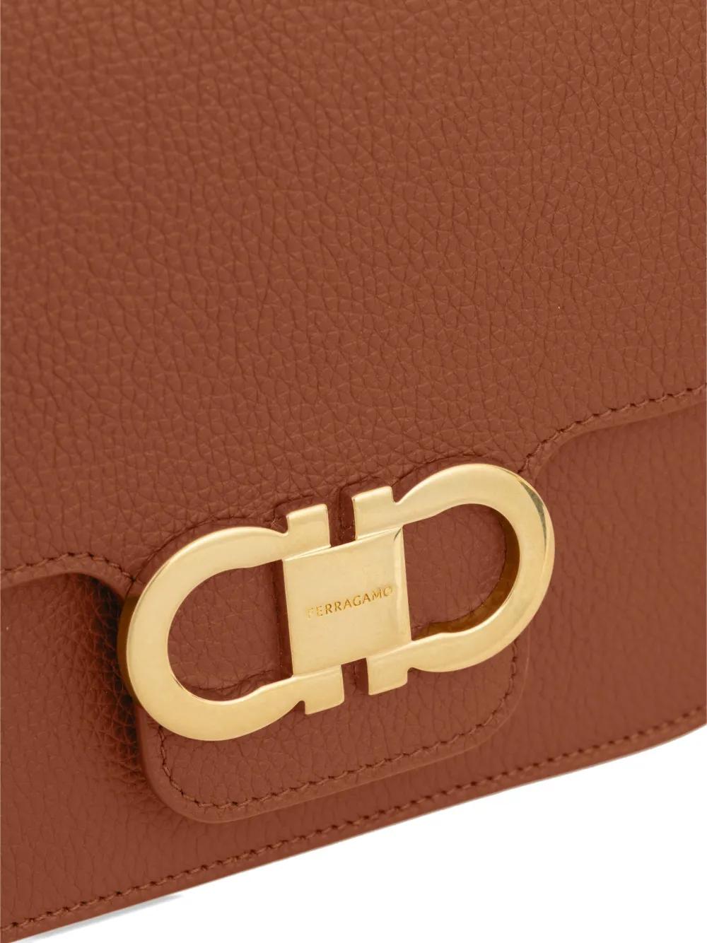 brown gold-tone Gancini plaque front flap closure adjustable shoulder strap internal slip pockets