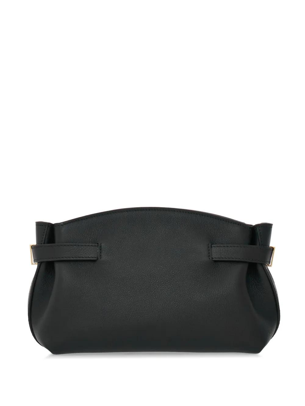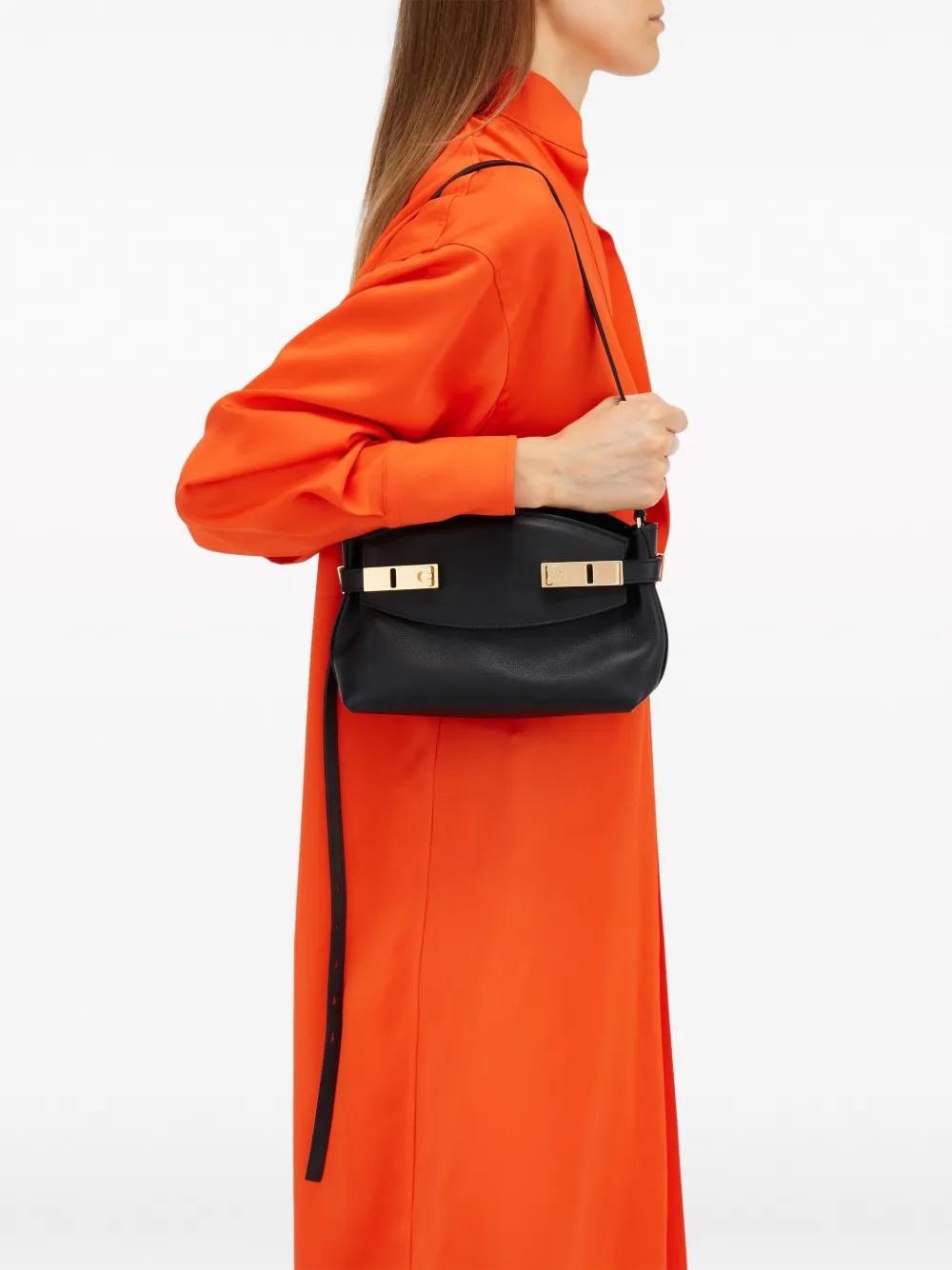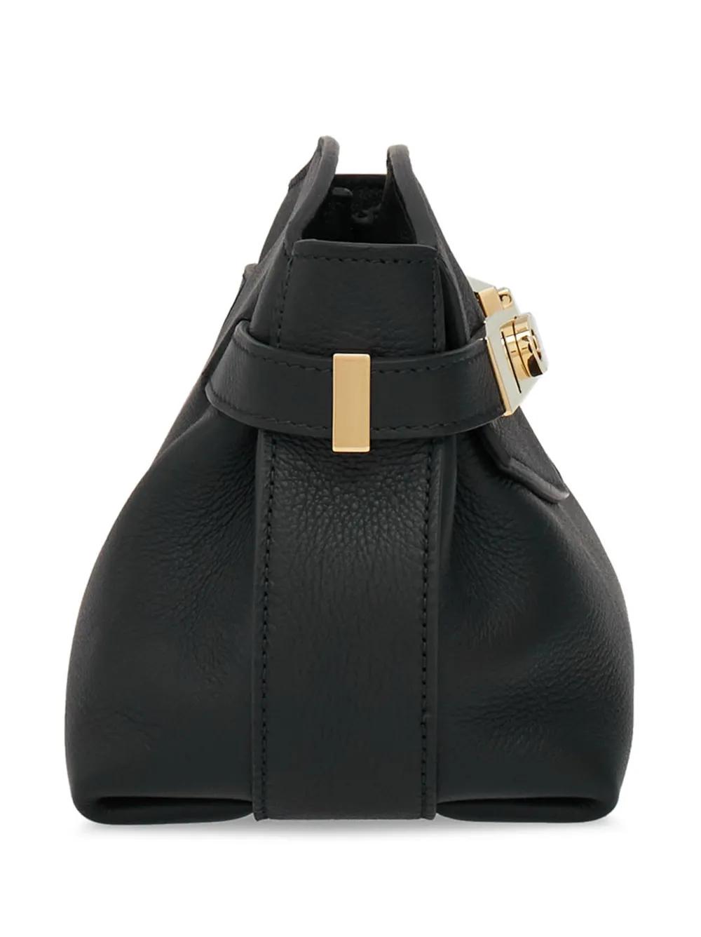 jet black leather smooth grain tonal stitching gold-tone hardware Gancini flip-lock fastening magnetic fastening adjustable shoulder strap main compartment internal card slots