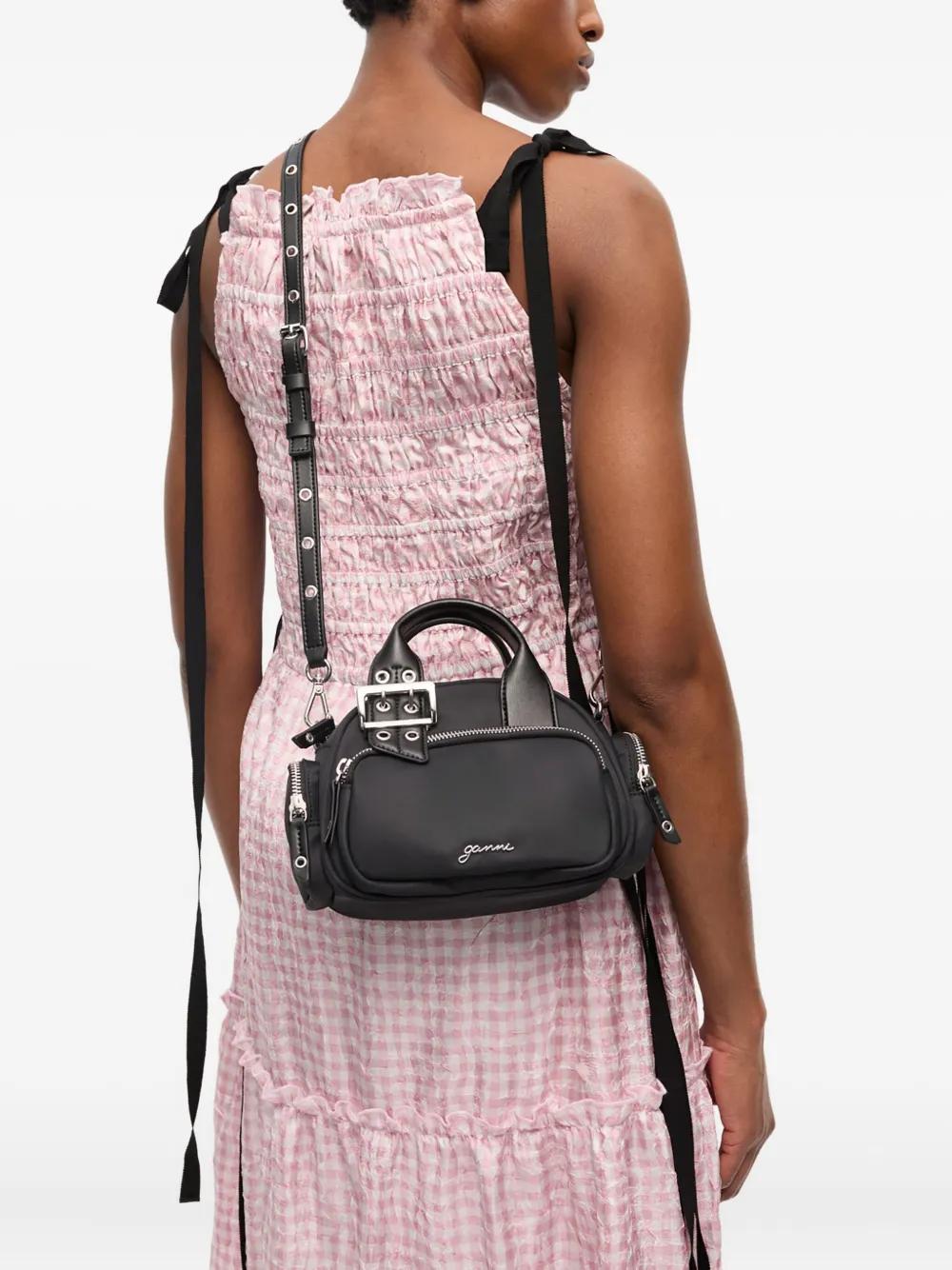black top zip fastening logo print to the front adjustable detachable shoulder strap two top handles