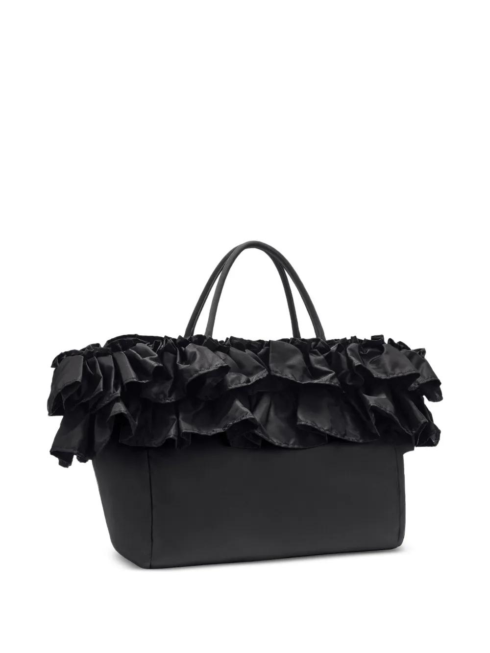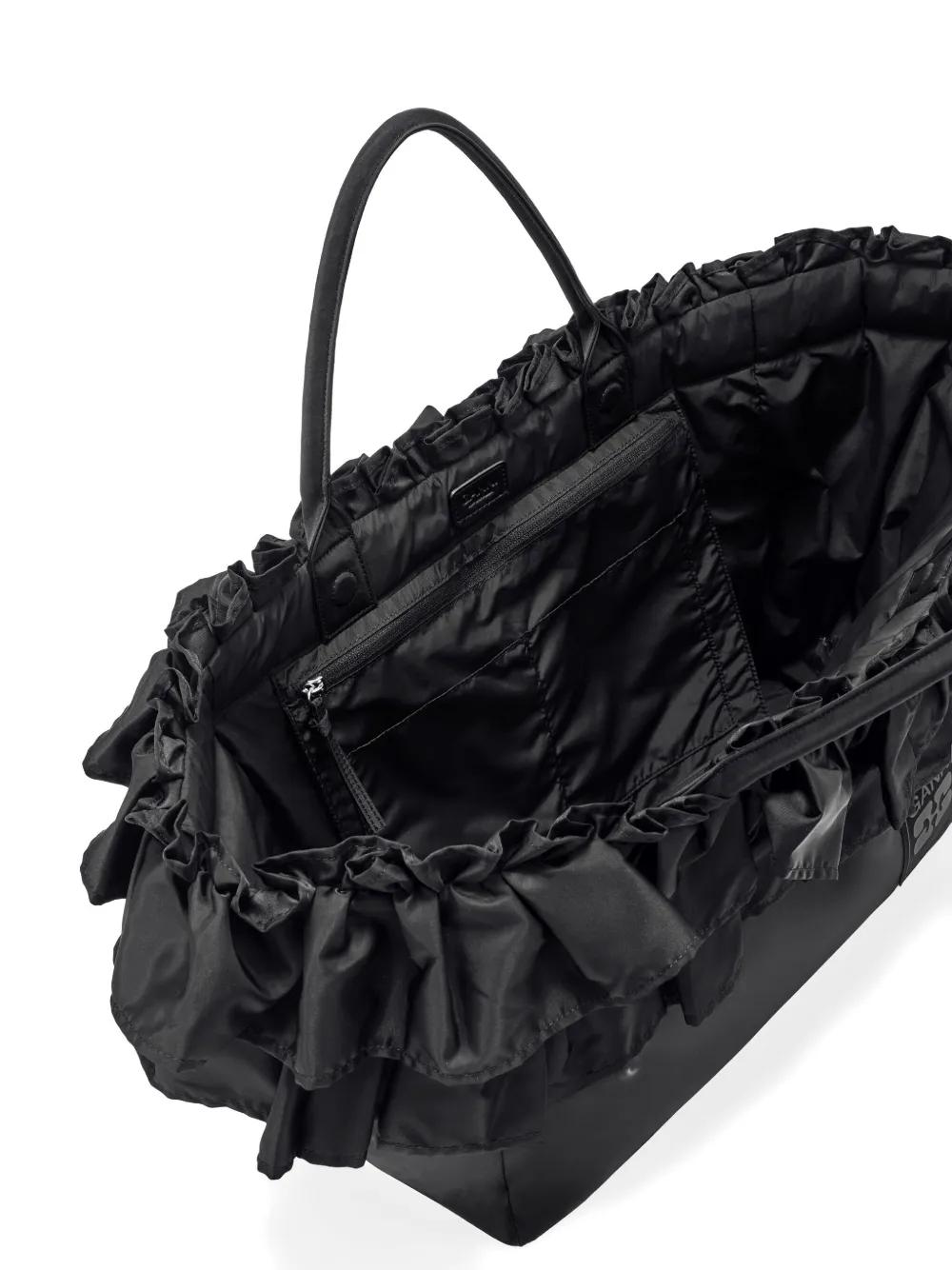 black ruffled trim top handle internal zip-fastening pocket logo patch