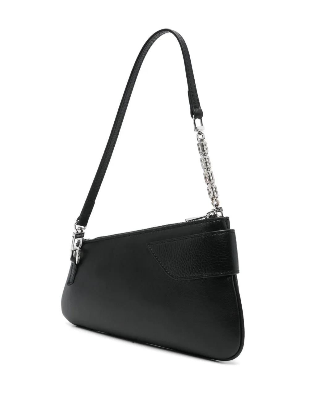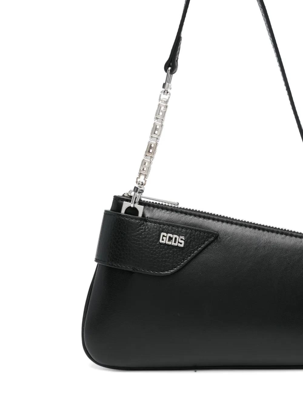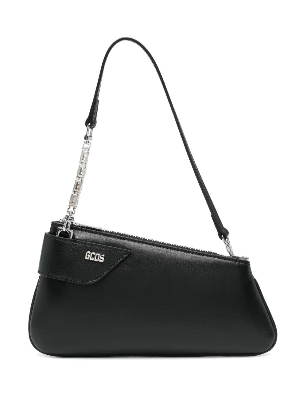 black leather silver-tone logo lettering panel detailing top zip fastening branded zip puller detachable shoulder strap with GCDS Cube chain detail logo-jacquard lining internal card slot main compartment silver-tone hardware This piece comes complete with a protective dust bag.