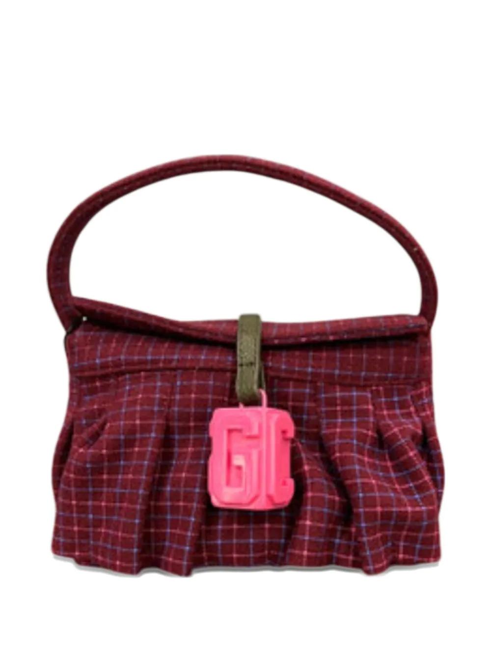 fuchsia check pattern top handle magnetic closure dice detail tone-on-tone stitching