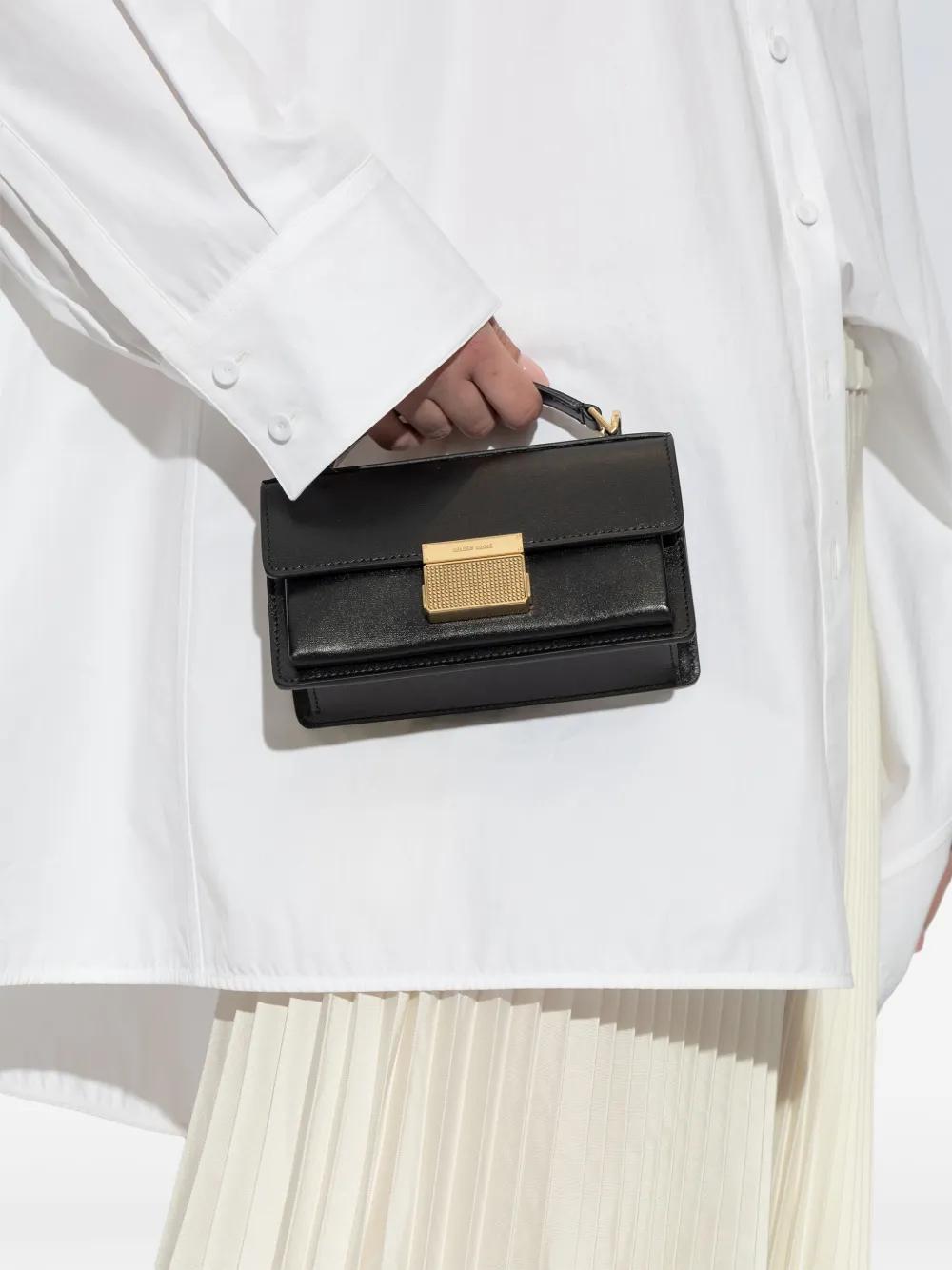 black calf leather smooth grain rectangle body single flat top handle adjustable detachable shoulder strap main compartment full lining gold-tone hardware gold-tone logo lettering front clasp fastening This piece comes complete with a protective dust bag.