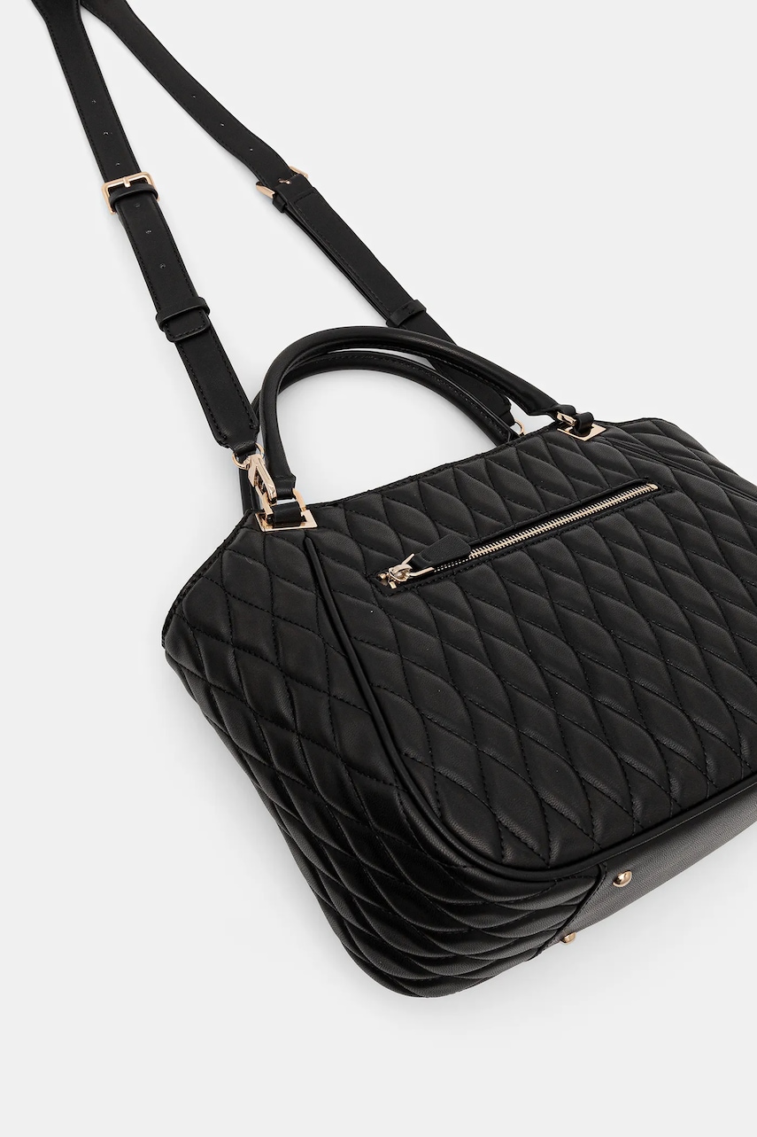 - Zawiera plastik pochodzący z recyklingu. - Komora zapinana na suwak. - Posiada trzy przegrody, w tym jedną zapinaną na suwak. - Trzy kieszonki wewnętrzne: jedna zapinana na suwak, dwie wsuwane. - Z tyłu zapinana na suwak kieszeń, która ułatwia bezpieczne przechowywanie telefonu lub innych drobiazgów. - Model z podszewką. - Nie mieści formatu A4. - Do modelu dołączony brelok. - Posiada uchwyty i odpinany pasek z regulacją. - Model wyposażony w metalowe nóżki, które zabezpieczają spód torebki. - Dołączony tekstylny worek zabezpiecza produkt przed kurzem. - Głębokość: 11,5 cm. - Wysokość: 24 cm. - Szerokość u podstawy: 32,5 cm. - Długość uchwytów: 39 cm. - Długość minimalna paska: 97 cm. - Długość maksymalna paska: 137 cm.