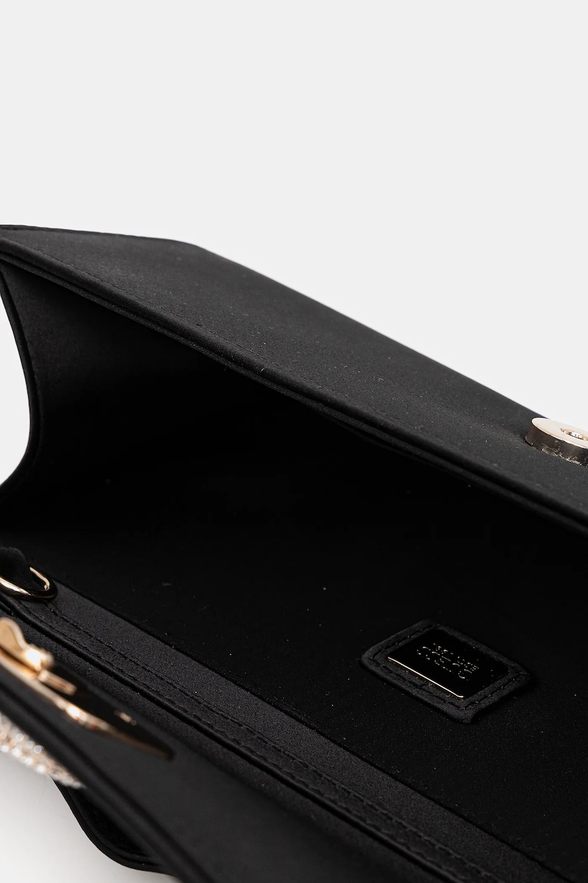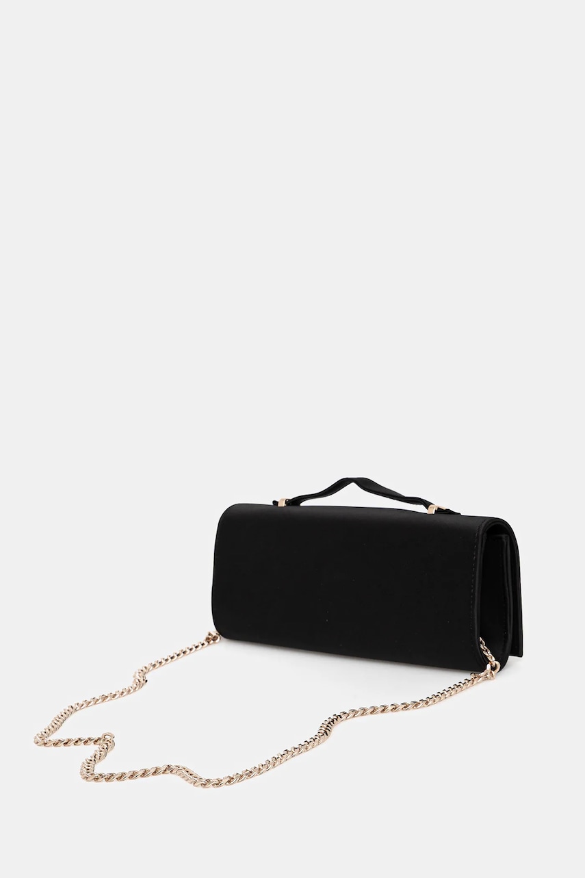 - Klapa zapinana na magnes. - Wsuwana kieszeń wewnętrzna. - Odpinany łańcuch. - Ozdobny detal z przodu. - Uchwyt do ręki. - Dołączony tekstylny worek zabezpiecza produkt przed kurzem. - Długość paska: 123 cm. - Głębokość: 4 cm. - Wysokość: 11 cm. - Szerokość u podstawy: 25 cm.