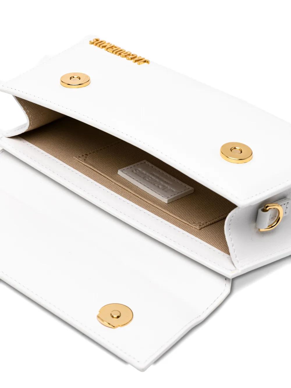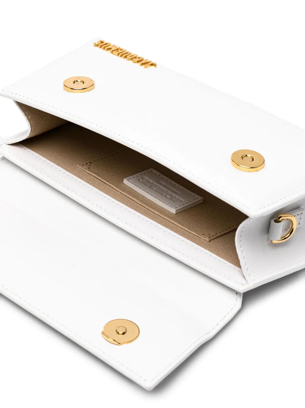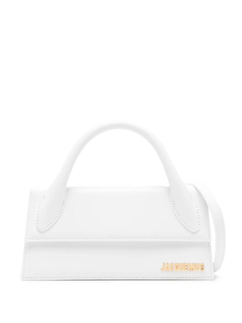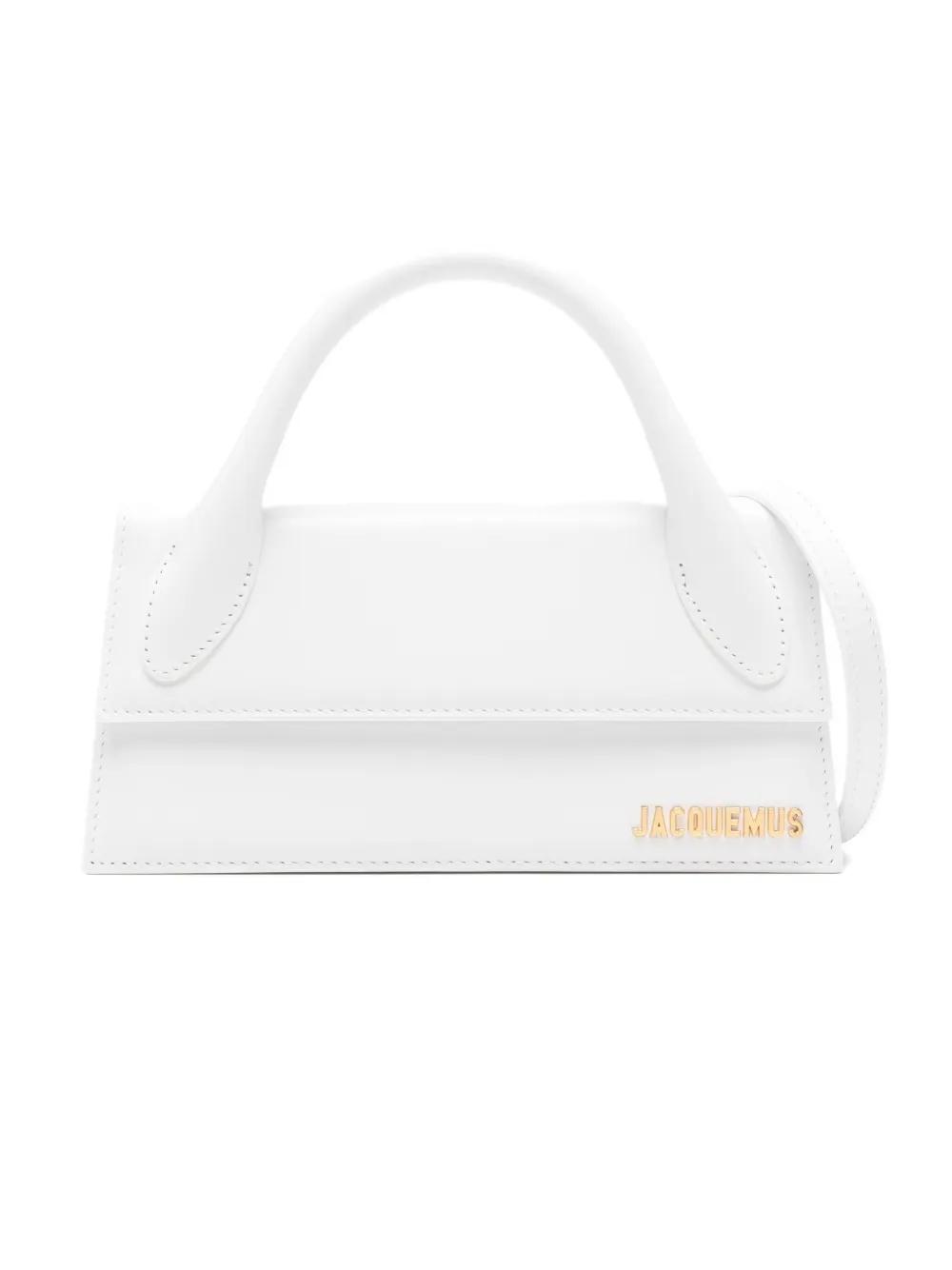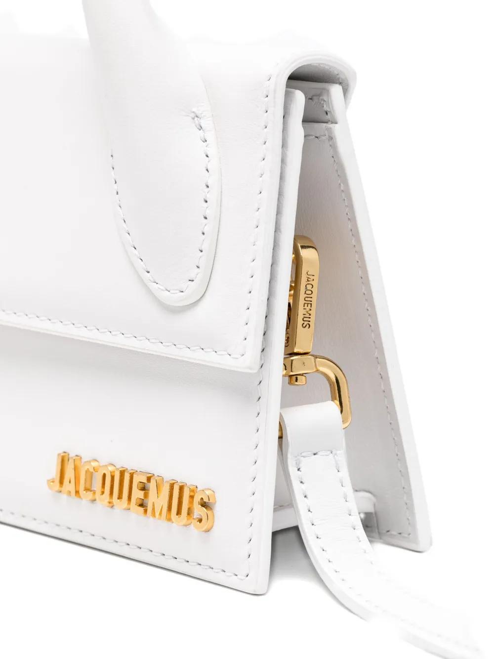 white single top handle detachable shoulder strap gold-tone logo lettering magnetic fastening stitched detailing