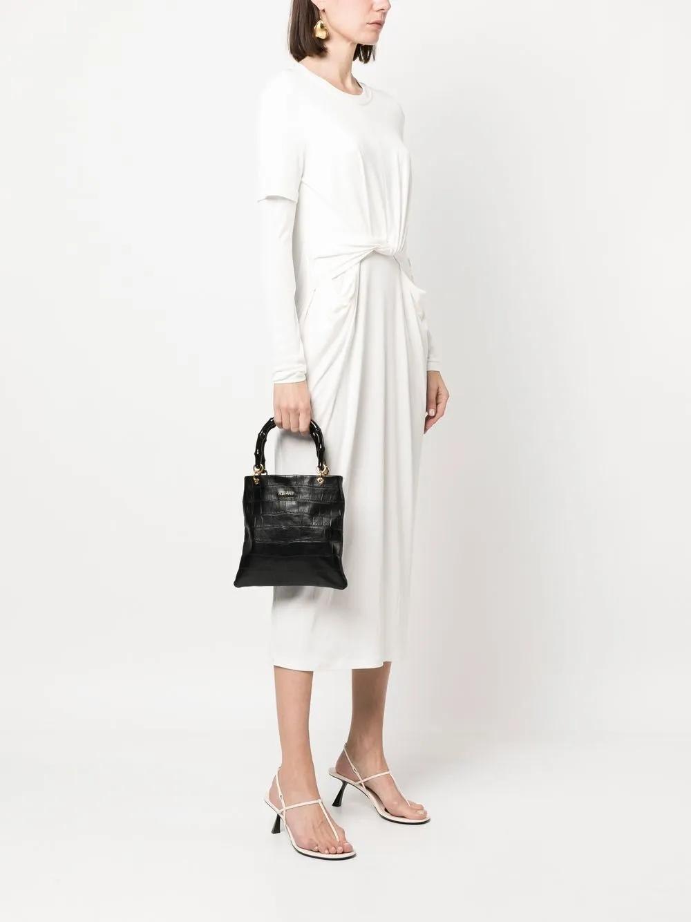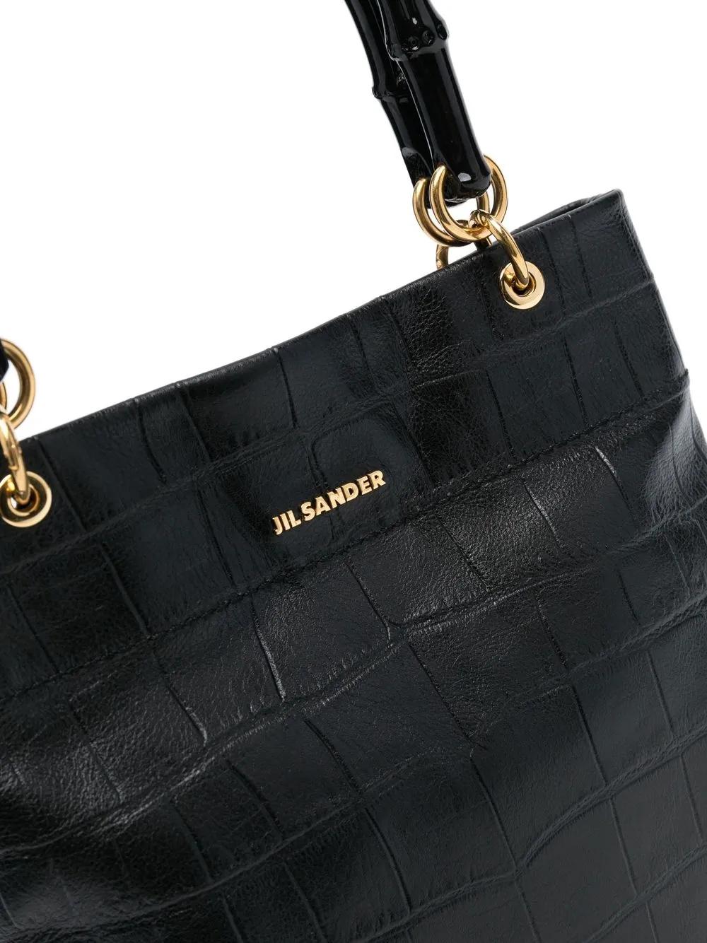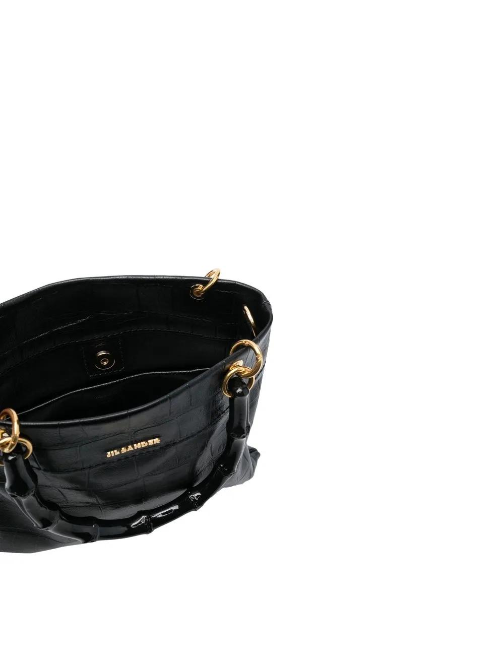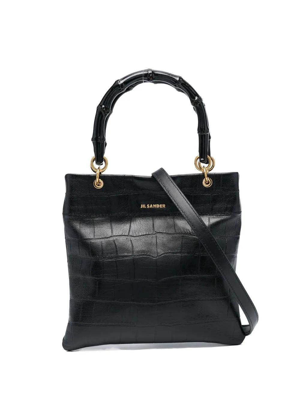 black calf leather gold-tone hardware embossed crocodile effect logo stamp to the front bamboo top handles adjustable detachable shoulder strap magnetic fastening main compartment