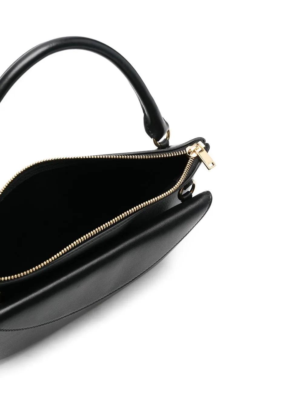 black calf leather front pouch flap-over pocket single top handle gold-tone hardware debossed logo to the front detachable shoulder strap top zip fastening