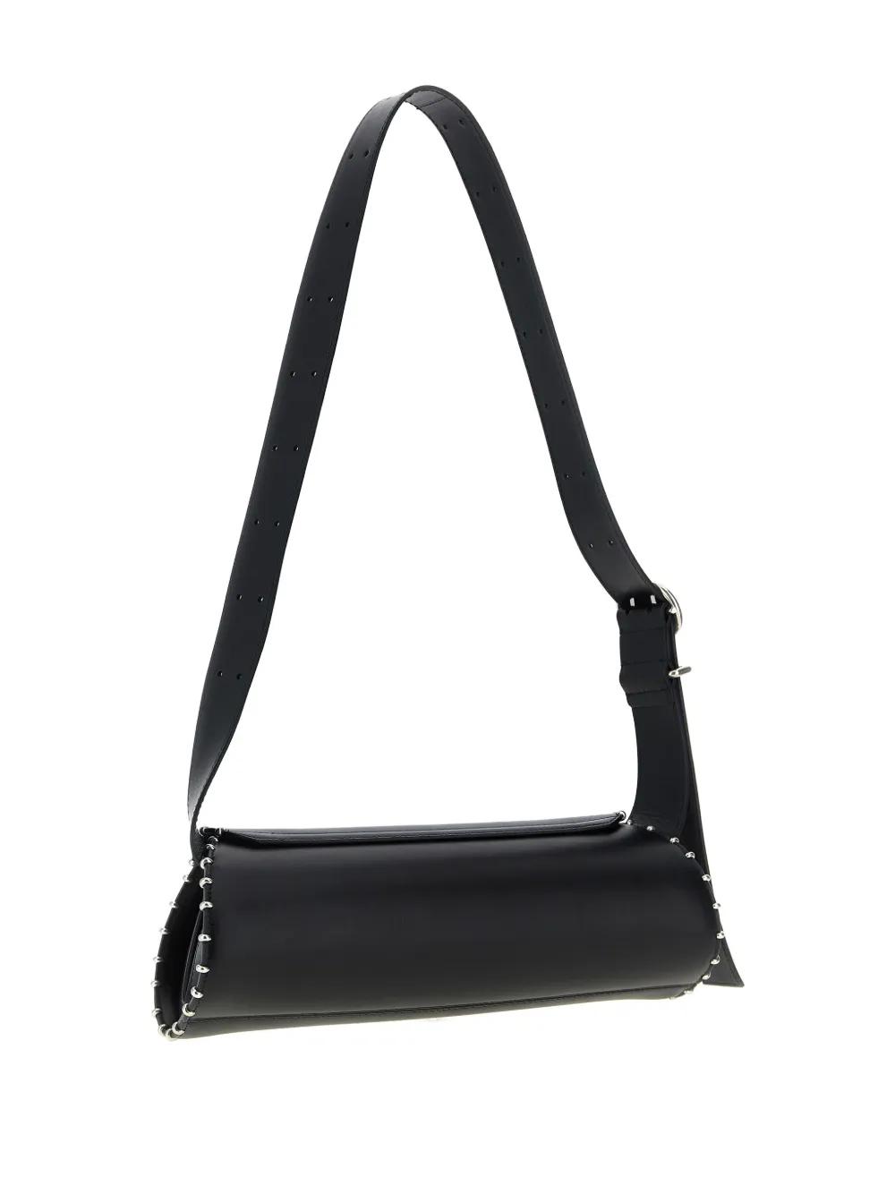 black leather stud appliqués embossed logo magnetic flap closure adjustable shoulder strap