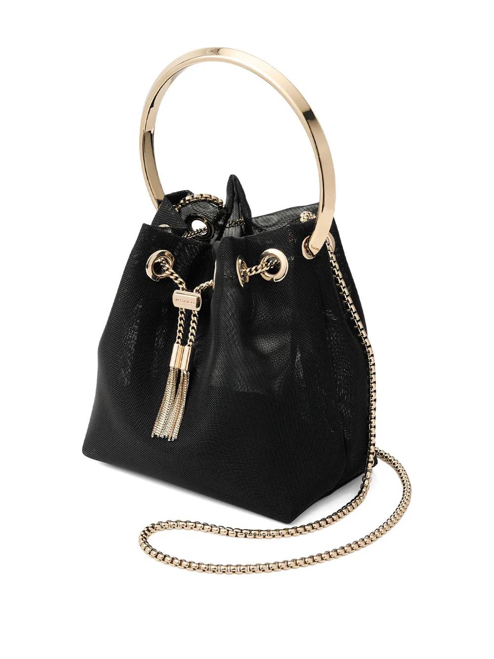black top drawstring fastening single metallic top handle detachable chain-link shoulder strap bucket body