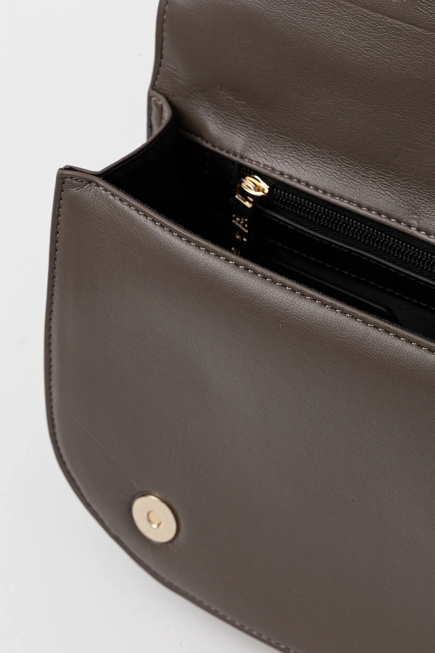 - Klapa zapinana na zatrzask. - Ozdobna klamra. - Nie mieści formatu A4. - Trzy kieszonki wewnętrzne: jedna zapinana na suwak, dwie wsuwane. - Model z podszewką. - Nieodpinany pasek z regulacją. - Dołączony tekstylny worek zabezpiecza produkt przed kurzem. - Długość minimalna paska: 69 cm. - Długość maksymalna paska: 120 cm. - Głębokość: 7 cm. - Wysokość: 15 cm. - Szerokość u podstawy: 21 cm.